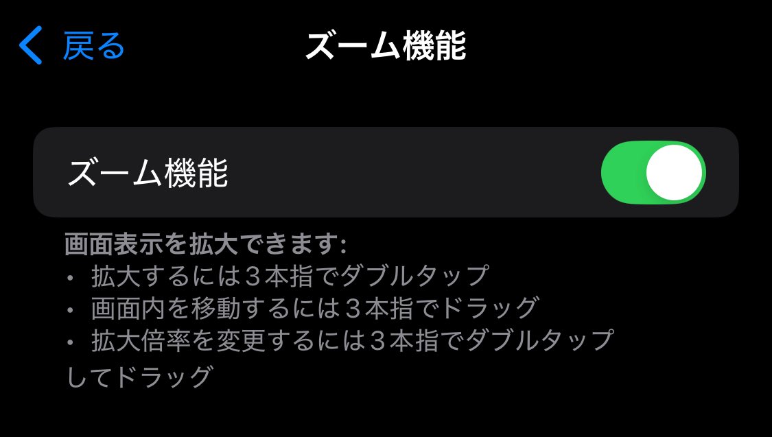 昨日同じ事になったな。確かにコレなら電源も切れなくなる(※拡大状態では電源を切るスライドバーが操作範囲外に表示される)iOSのアクセシビリティでズーム機能を操作するには画像の通り。拡大のオンオフは「三本指でダブルタップ」という普段やらないだろう操作 https://t.co/r9INPZZhes