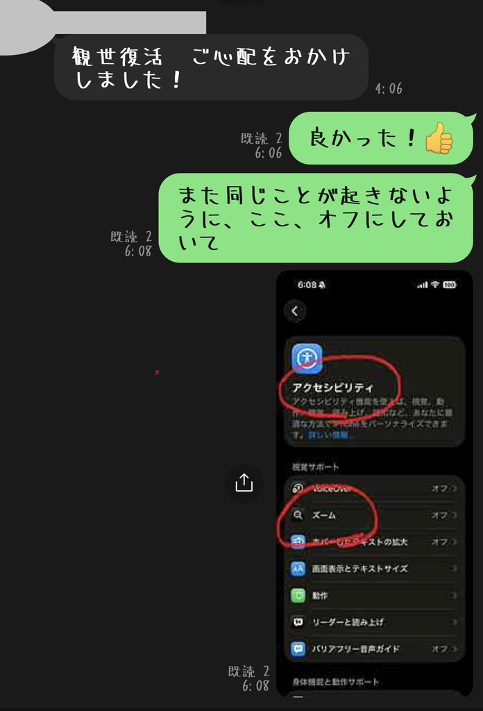 母「スマホの文字が大きくなって戻せないの」私「設定のアクセシビリティから変えられるよ」母「それが、設定出せないの」私「???画面の写真撮って送って」↓