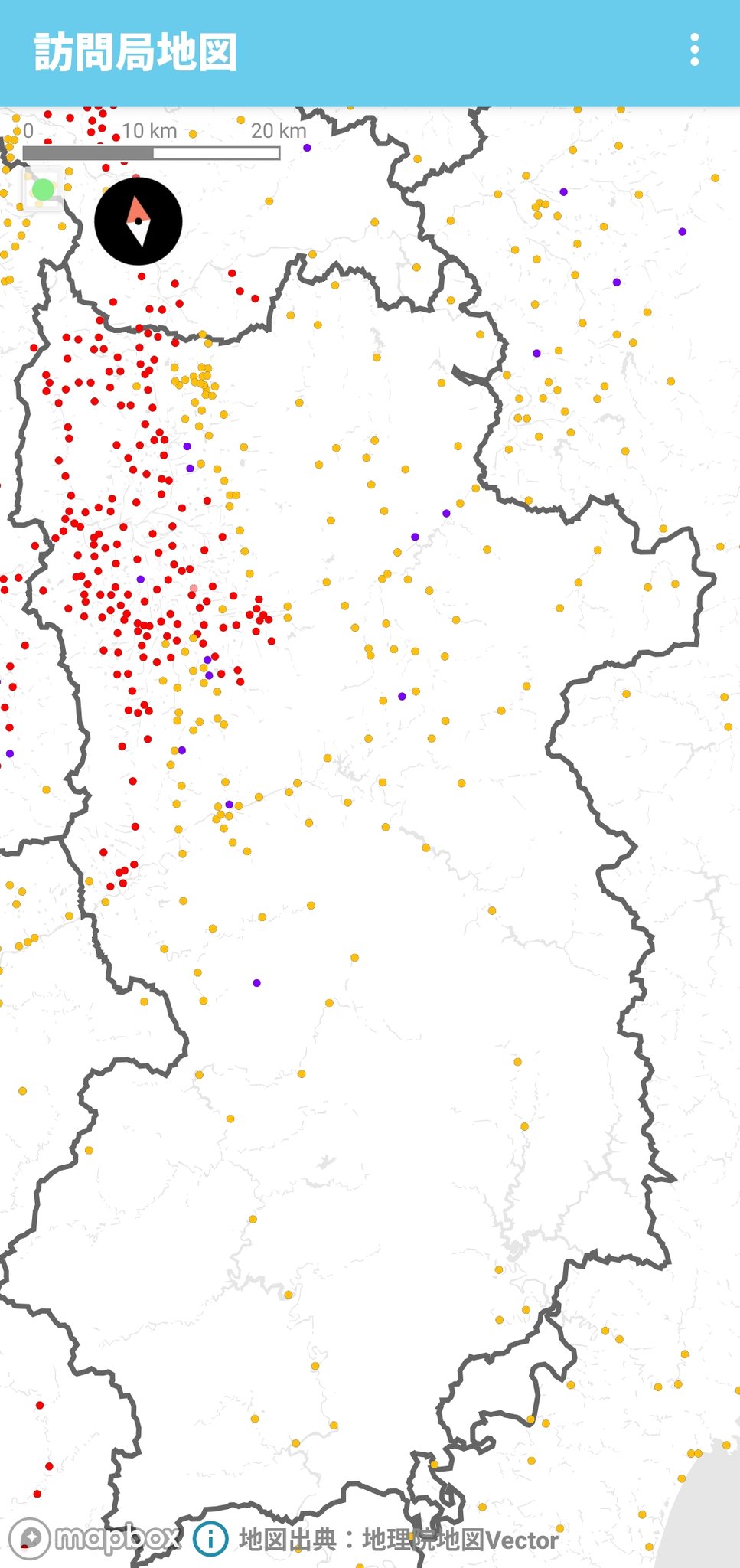 (アプリ「訪問局地図」より)奈良県の郵便局分布は人口密度がよく顕れています。険しい山の中でも人が一人でもいる限り、郵便局は稼働し、局員が働いています。本当に頭が下がります。※赤は個人的に訪問した局、黄色は未訪問、紫は一次閉鎖局です https://t.co/6UrNgvC1Yd