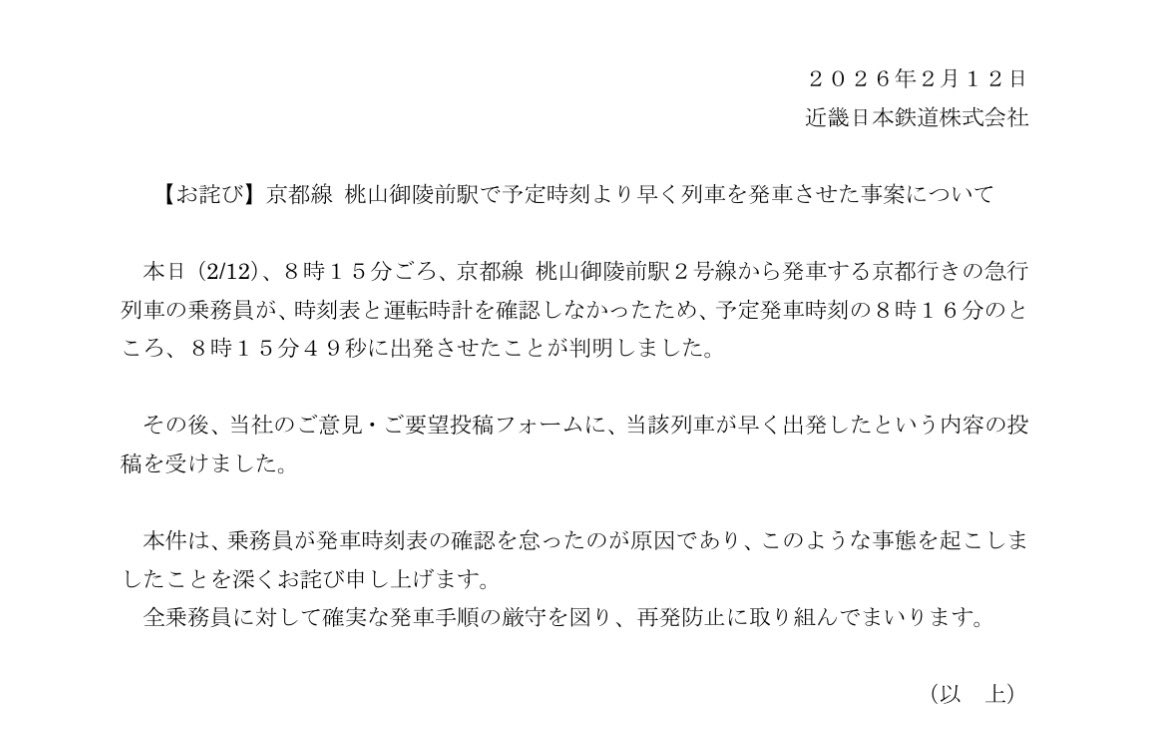 【異様】日本の鉄道会社、たった11秒早く出発しただけで謝罪文を出してしまう🤔