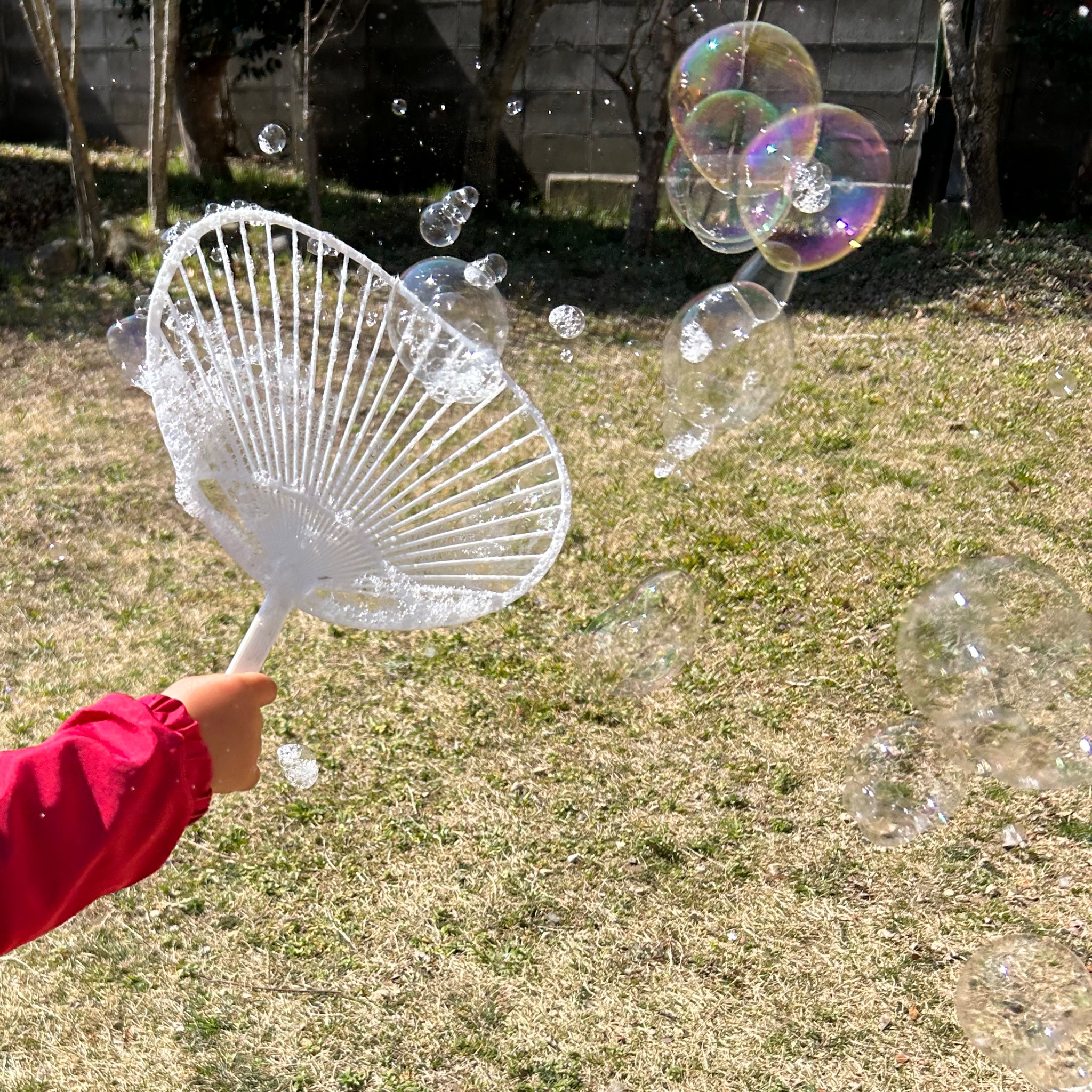 3歳以下の子にシャボン玉させる時、うちわの骨使うのが最適解かも!シャボン玉おじさんが使ってたアイテムで、小さい子でもふりふりしやすくてたくさんシャボン玉できる!シャボン玉液に土がつくとすぐダメになっちゃうけどこれなら管理もしやすいよ🫧 https://t.co/0YyQFpAUjR