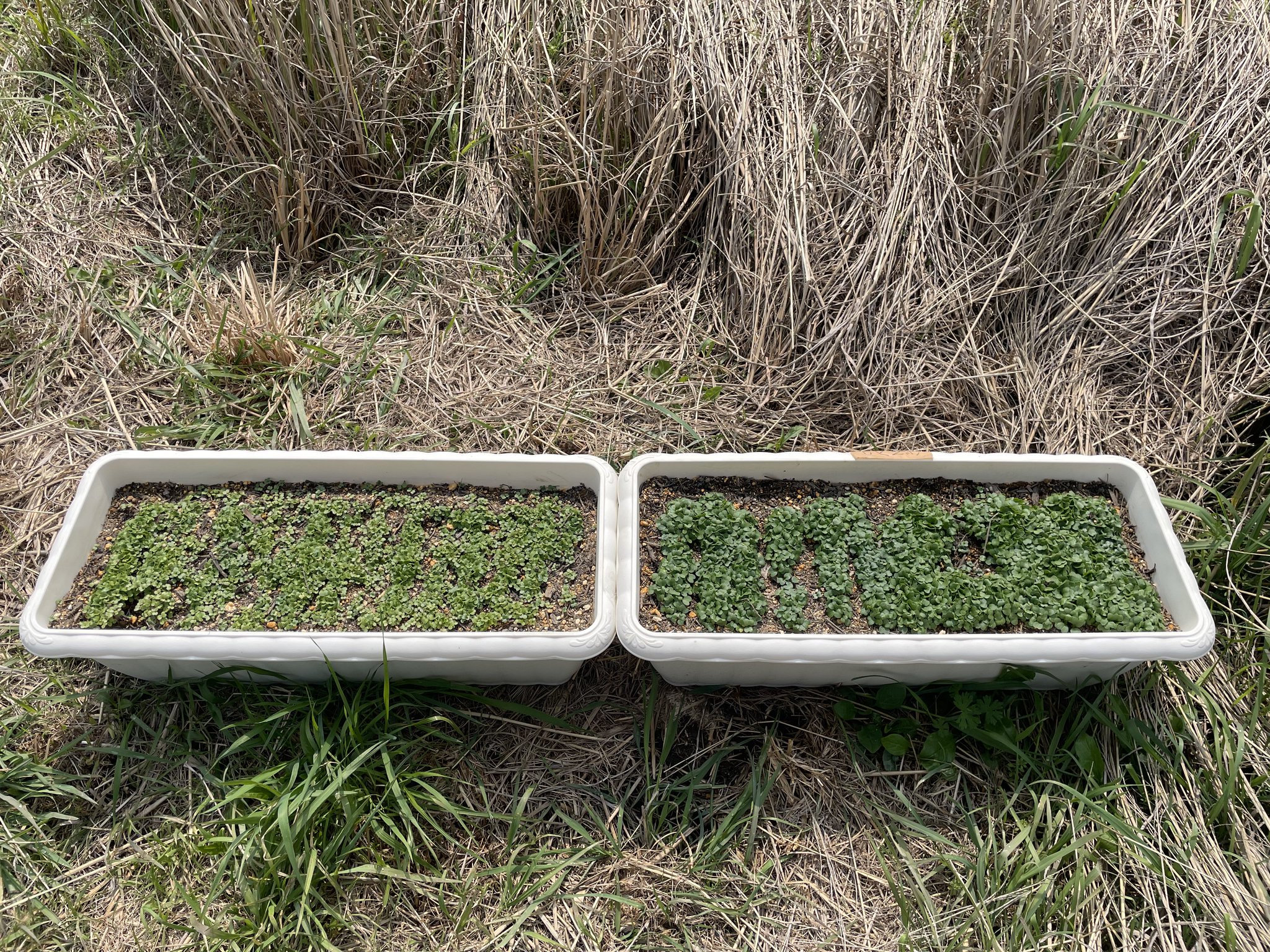 昨年バスを埋めたプランターの現在右のプランターがバス入り、左のプランターがバスなし、植えた植物は小松菜です発芽から1週間で早くも成長に差が出てきました生命の力を感じます https://t.co/xHfe1ZzPB4
