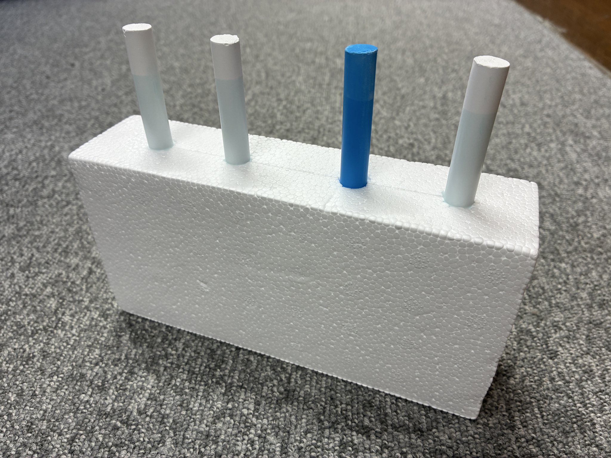 100均の発泡スチロールにドリルで穴を開けて、チョークを挿す。これで英語指導用の4本線ライナーの出来上がり。これを職場で配っているおっさんがいたら、そいつが僕です。 https://t.co/UsboaZQjf0