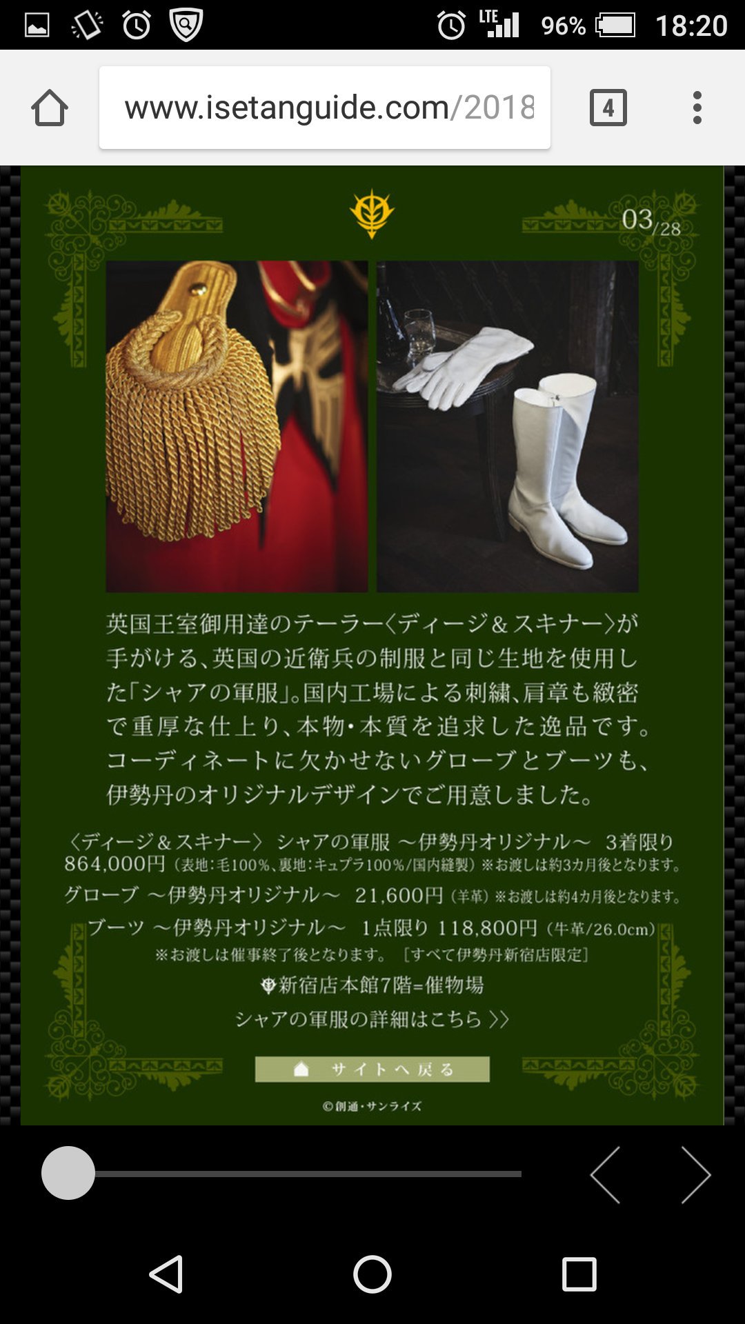 伊勢丹、総額100万の「シャア軍服」を限定発売! ファースト世代の財布を狙い撃ちww 2018/4/25 12:00 アート・イラスト・デザイン, ニュース・社会, 画像 0 スポンサードリンク [投稿元ツイート:MOO@m @マグステbotさん] [投稿元ツイート:MOO@m @マグステbotさん] [投稿元ツイート:MOO@m @マグステbotさん] [投稿元ツイート:MOO@m @マグステbotさん] 3点揃えるとまさかの100万円オーバー…。3着限定ならサイズはオーダーメイドにしてほしいですねぇ。 機動戦士ガンダム×ISETAN WELCOME TO ZEON|2018|伊勢丹新宿店 追記:ちなみに今日(25日)からなんで、即売り切れの予感。