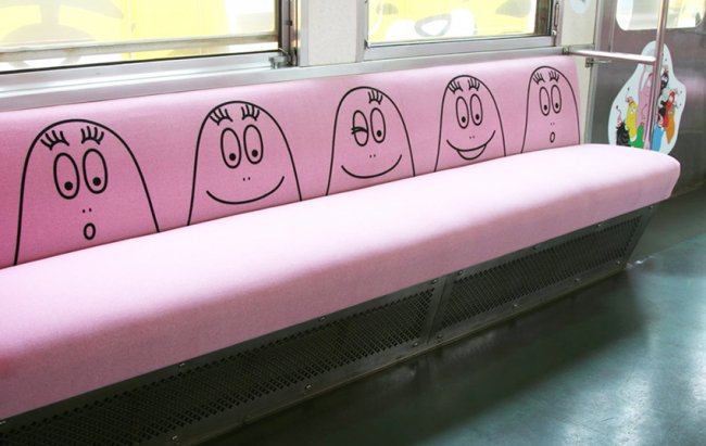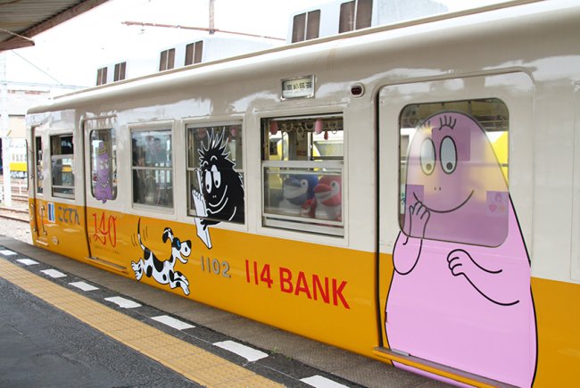 香川県の高松琴平電気鉄道で4月から運行している「バーバパパラッピング電車」。窓部分も使ったデザインのためか、中から見るとホラーなことになっているようで・・・
