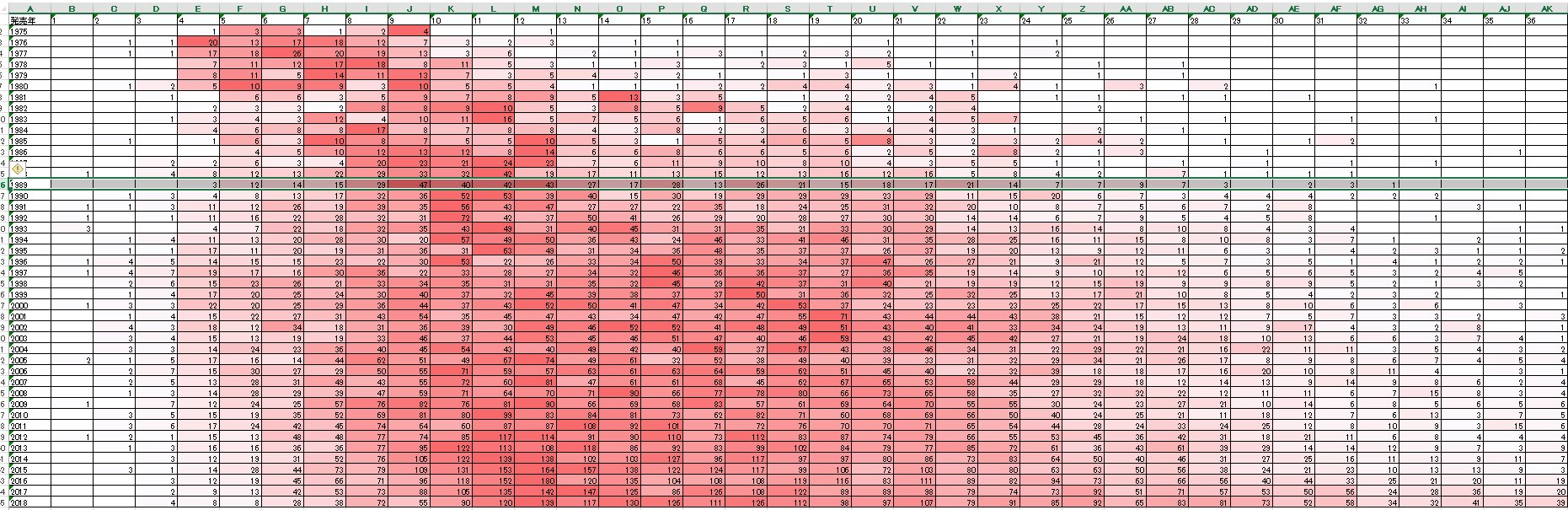 その年に発売されたライトノベルにおけるタイトル文字数の分布。横軸は文字数ですが収まりきらない分はカットしているそうです。件数が多いほど赤くなっていますが、数値を見た方がその顕著さがよくわかると思います。