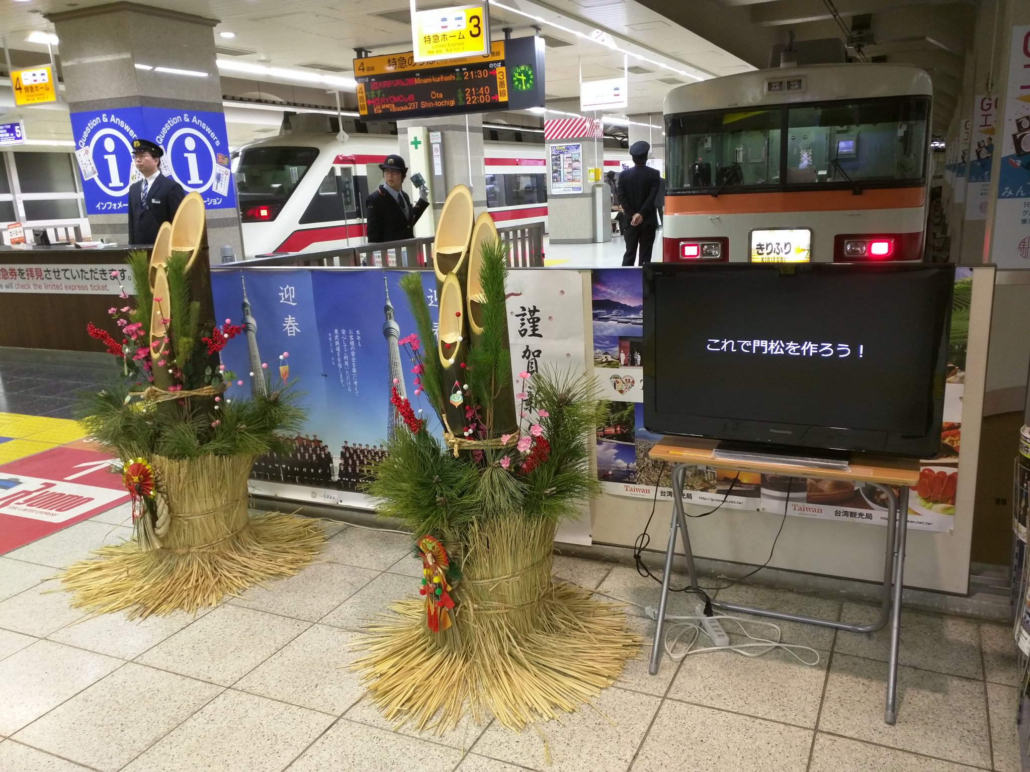 浅草の特急ホーム前に門松があるんですが、その脇でそれを作る駅長氏の奮闘記を上映する東武はやっぱり斜め上を行ってると思います。 pic.twitter.com/nxghdVKXV2