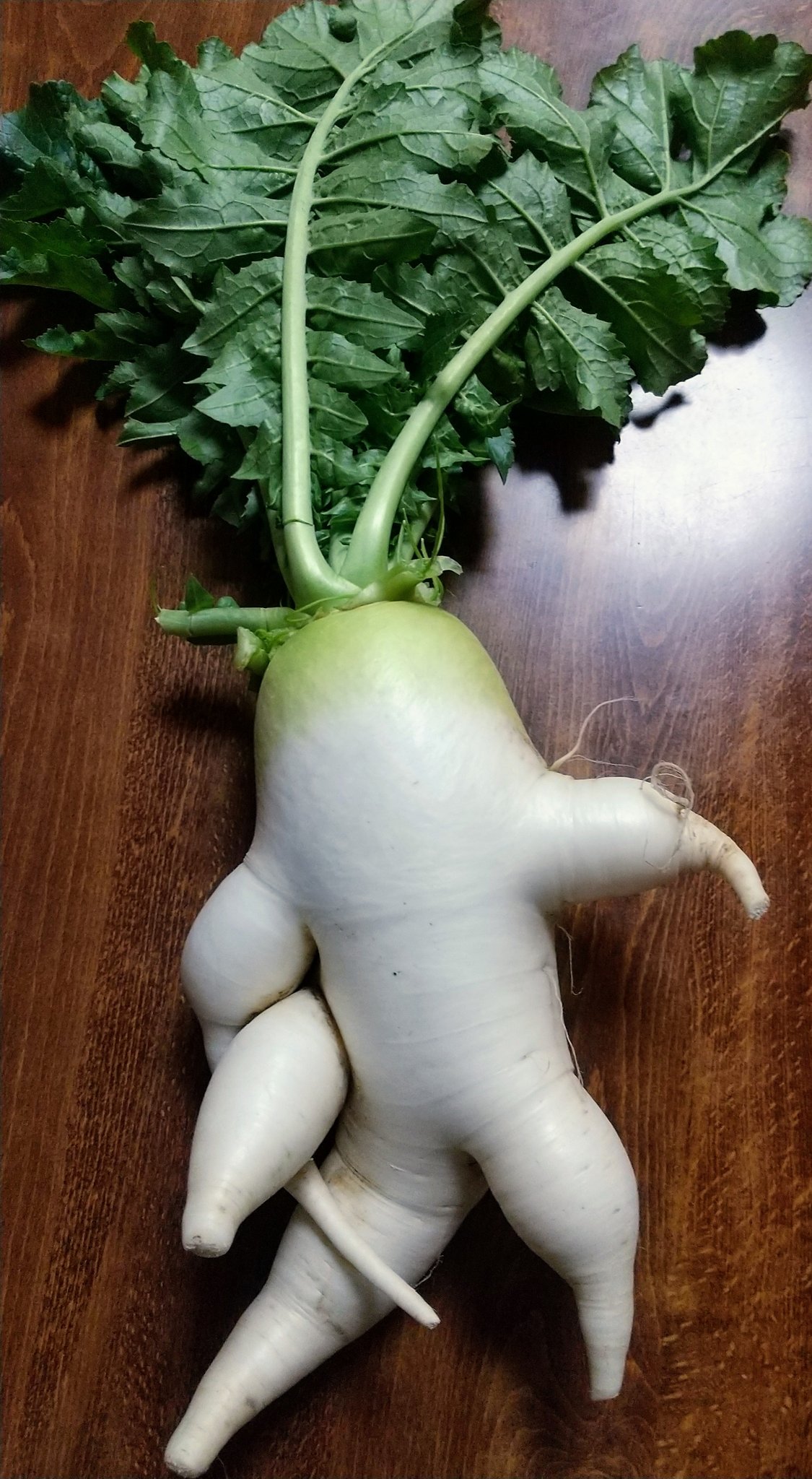 冬コミ一色のTLですがうちの畑で大根を小脇に抱えて逃げようとしている大根が捕獲されたので置いておきますね https://t.co/5mjpuOY998