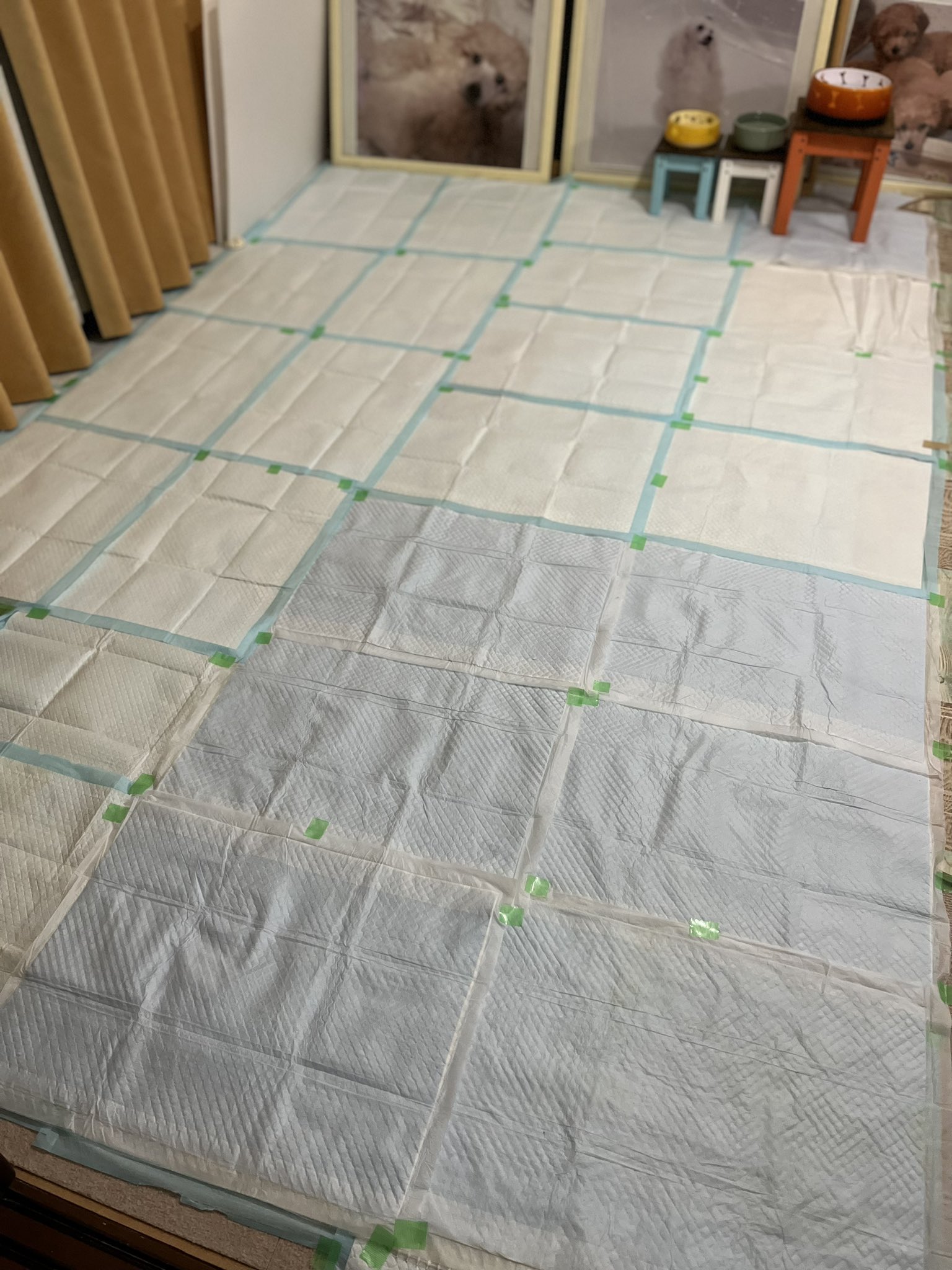 ↑これがベースのペットシーツその上に100均の滑り止めを敷いて、さらにその上にペットシーツ敷き詰め、テープで細かく固定して完成!シーツ一枚だと隙間から床に漏れるし、テープで止めないと後ろ足を擦って歩くので、足に絡まってシーツ全部剥げてしまいます。なかなか重労働です😅 https://t.co/1Njl1580c4
