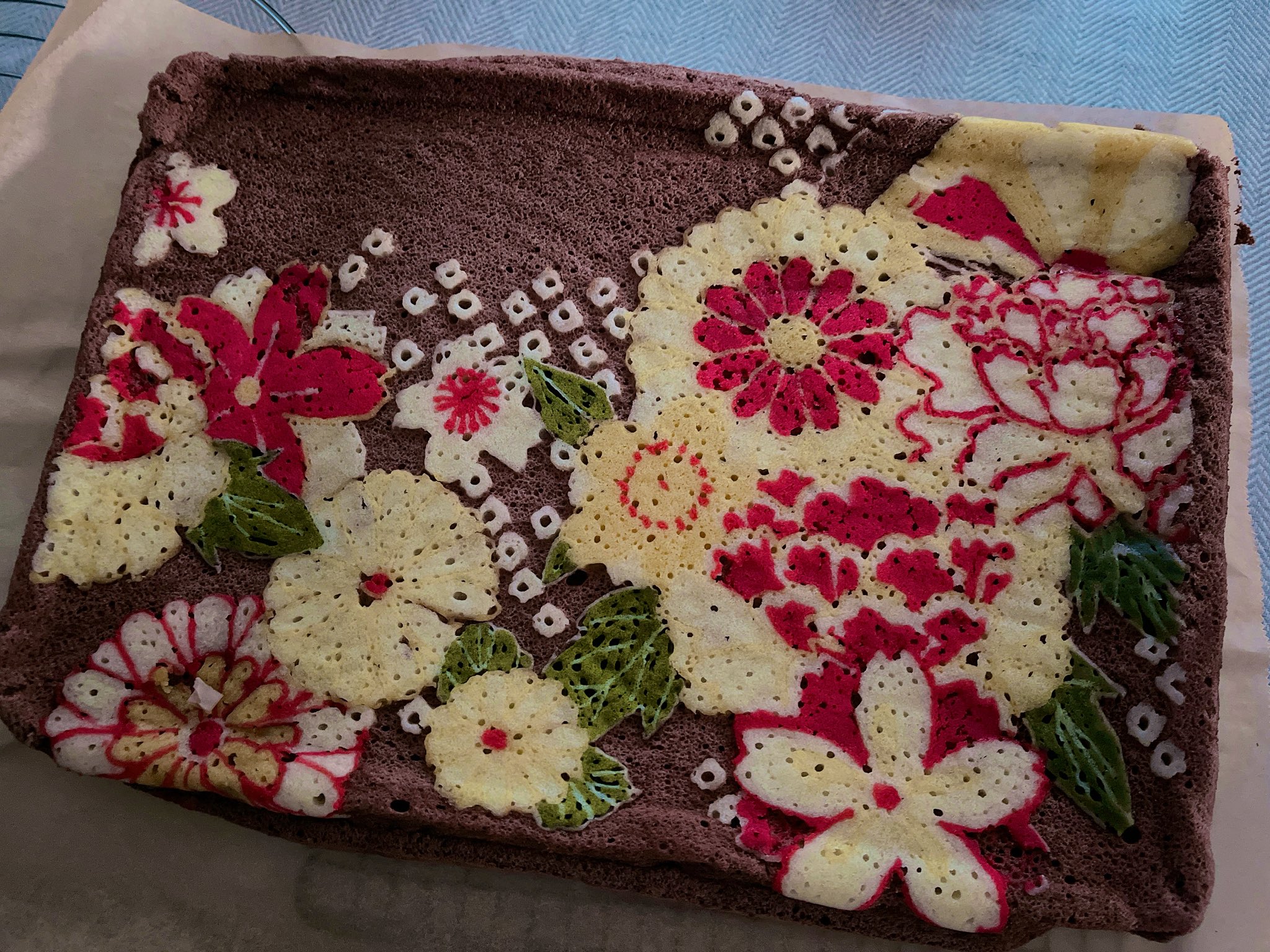 着物ロールケーキの生地。巻く前の方が柄がよく見えて好き。着物柄に見える? https://t.co/tr3VHpuPi3