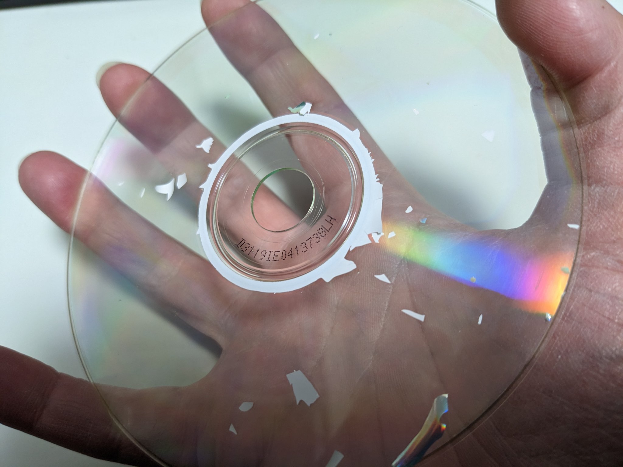 @yishii ダ〇ソーで買った激安CD-RWを使いまわしていたらポリカーボネートから反射層がはがれたことがありました。その時もこんなに奇麗にははがれませんでした。CD-Rがこうなったのは初めて見ました。