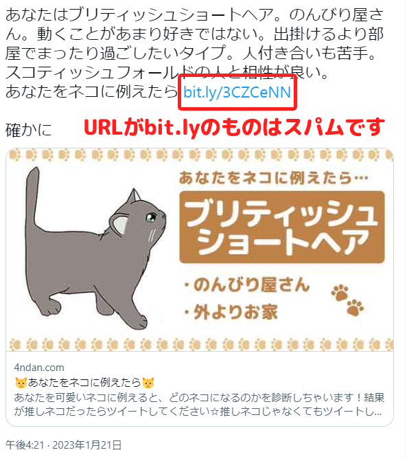 【注意喚起】診断結果ツイートのURLがbit,lyになっているものは乗っ取りスパムなので開かないでください。アカウント連携すると乗っ取られます。そして乗っ取られると勝手にbit,lyの診断結果ツイートが投稿されるようになります。 https://t.co/lQ0uM5NjXk