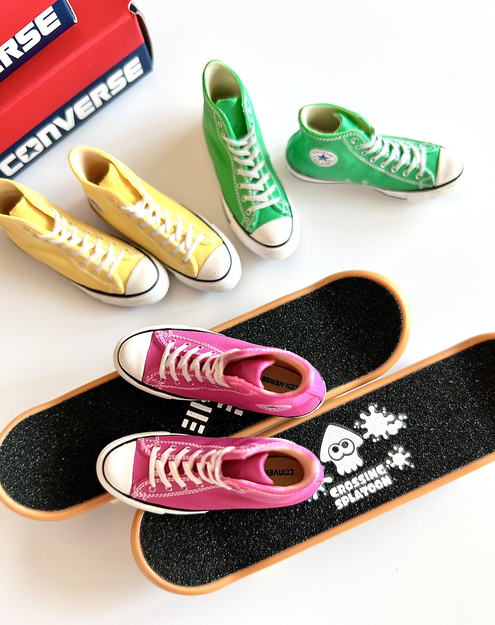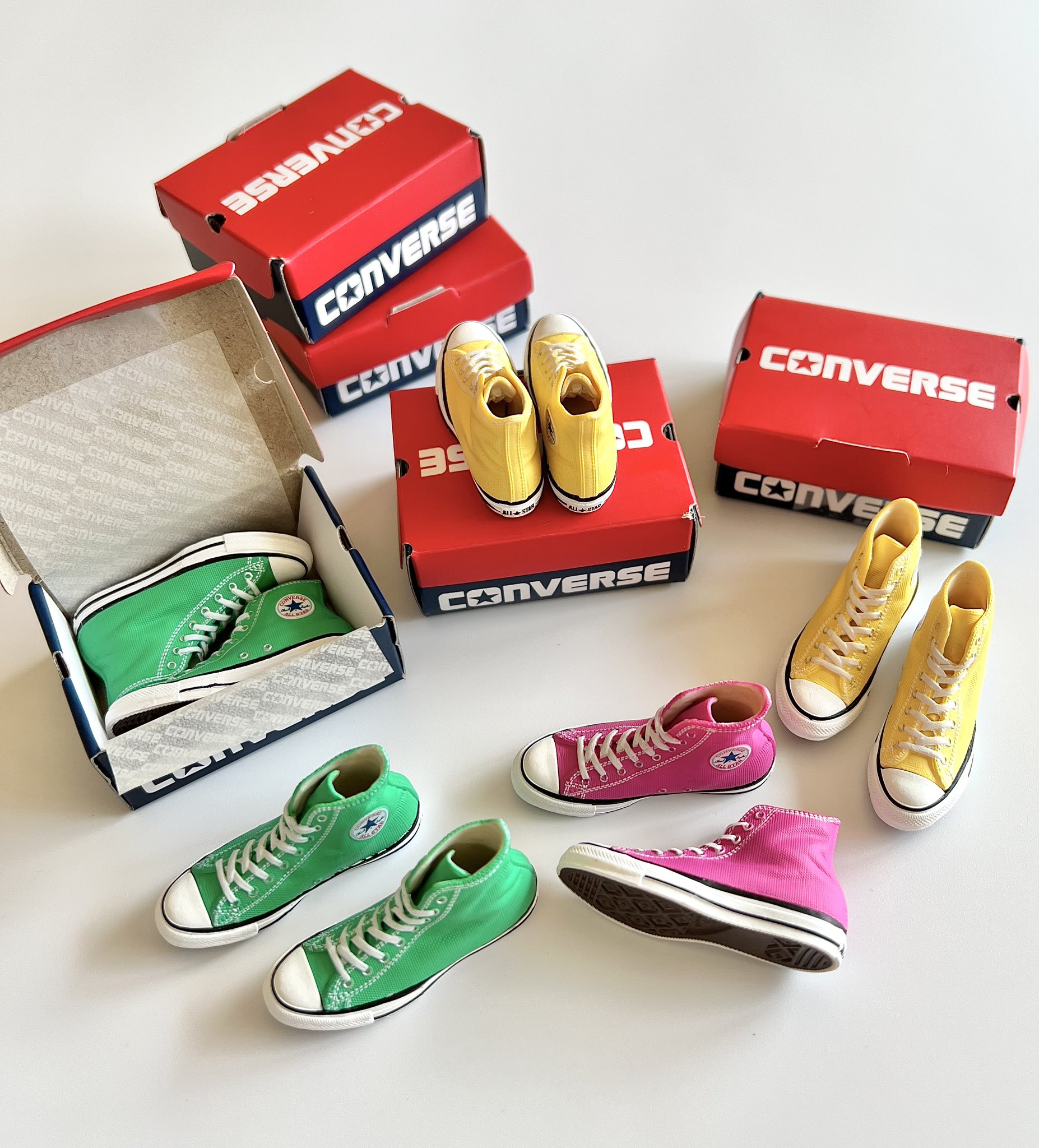 5回まわして2色被り。1番ほしかったピンクが出て嬉しかった。意外と定番カラーが出なかった。スニーカーの中にもコンバースのロゴが…2021年のDUNKガチャと同じくらいのサイズ。 https://t.co/E06ifvNoGg