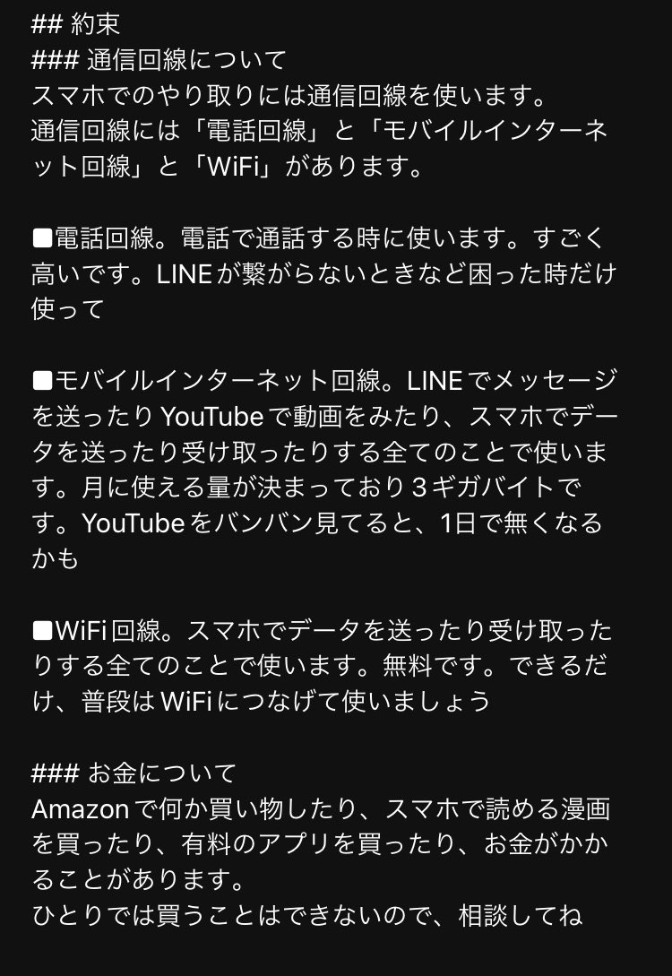 @fkjk 内容的には大事だけど、初スマホで浮かれる12歳向けでは無い説も……「モバイル回線でつべ見てたらすぐ重くなるからWiFi使って!」「電話するのは本当に困った時だけ!」「ネットの相手と話す時はペラペラ自分のこと喋らない!」くらいのノリで言ったらワンチャンもう少し文字数くれたかもしれない←