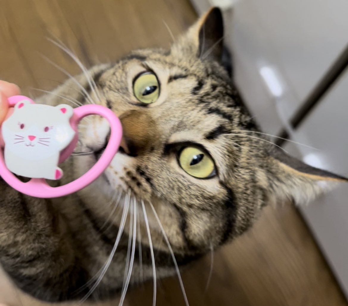 一応注意…猫に赤ちゃん用のおしゃぶりを与えるのはやめて下さい。牙で千切れてしまいシリコンの部分を誤飲する恐れがあります。この子も気に入ってたようですがもう没収済み!