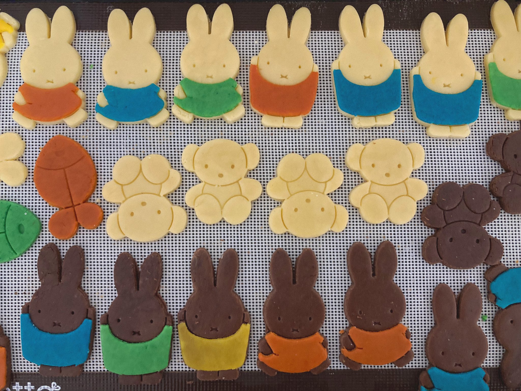 @mamiponyu244 プレーンの生地に、スーパーで売っているような食用色素を後から混ぜ込んで色付けしてます!色付けした生地を型で抜いて服の部分だけ被せて焼きました!!説明下手で申し訳ありません💦