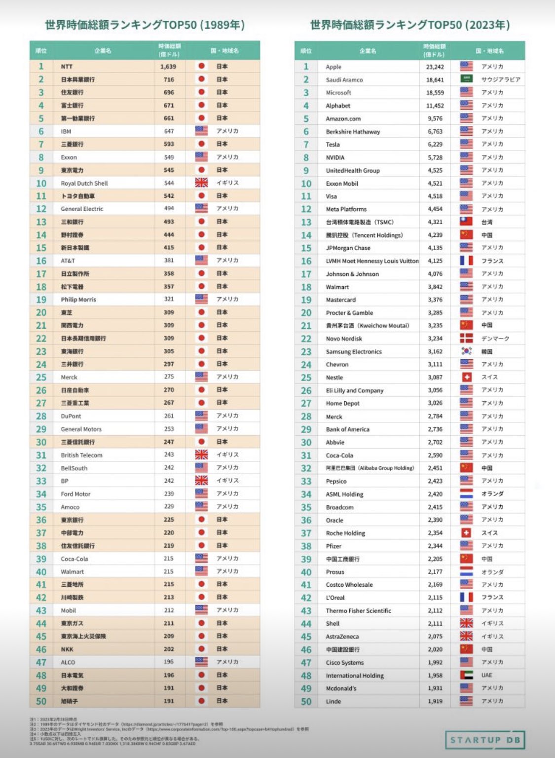 世界の企業の時価総額ランキングTop50最新版。ついに日本企業が姿を消した。1989年と比べるとかなりの変化。@fwtetsu のポストより。 https://t.co/A1bueoqNAv
