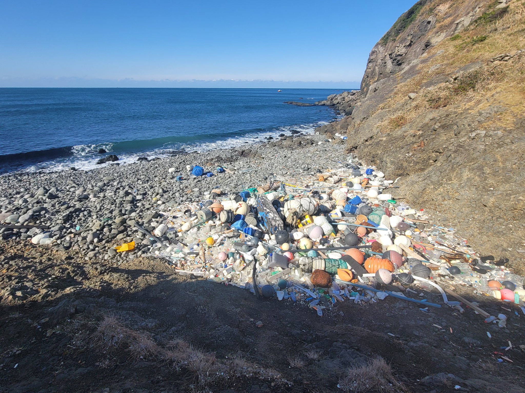 @fireroadster ほんとにそうなんですよね。崖の上の道から透き通った綺麗な海が見えて、海岸まで降りていったら打ち上げられたゴミでいっぱいでした。ほとんどは漢字とハングルでした。漁具にも見慣れない漢字があったので漁具もあちらからのゴミだと。 https://t.co/yONTxYc845