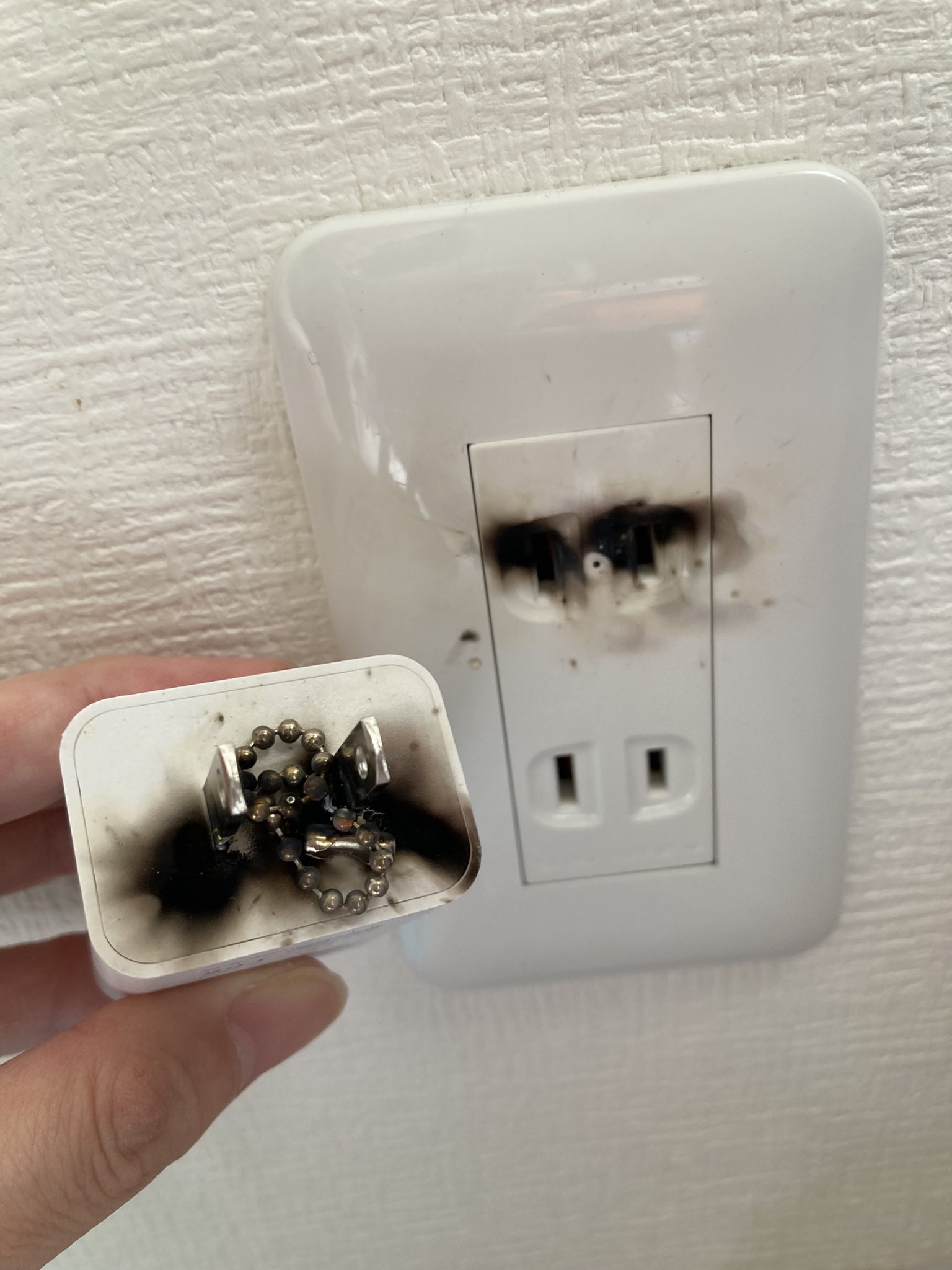 あわや大惨事でした。刺さりが甘く金属部分が露出していたコンセントに、娘がボールチェーン落として火花散った。幸いなことに、手で持ったままチェーンを垂らしたのではなく「落とした」と思われる為、娘に怪我はなし。手で持ってたら感電してたと思うと恐ろしくて…。 https://t.co/AuCU6zy2Kg