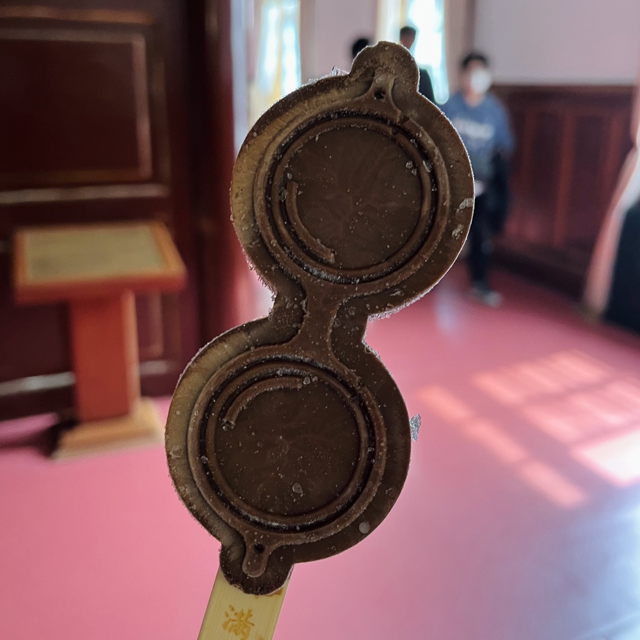 中国の観光地はだいたいどこでもご当地アイスを売ってるけど、まさかラストエンペラー溥儀の眼鏡までもが公式アイス(チョコ味)になってるとは思わなんだよ。 https://t.co/hAWxJSzkpj