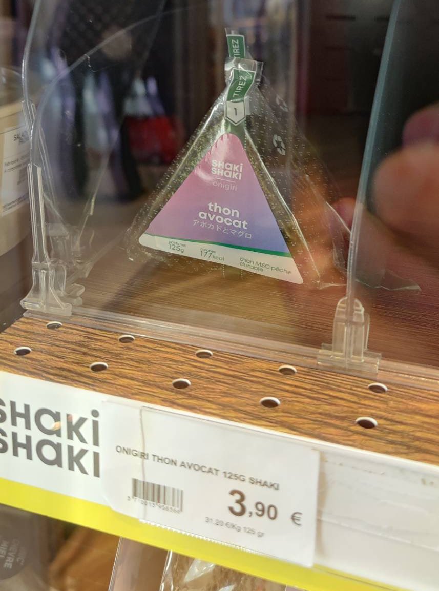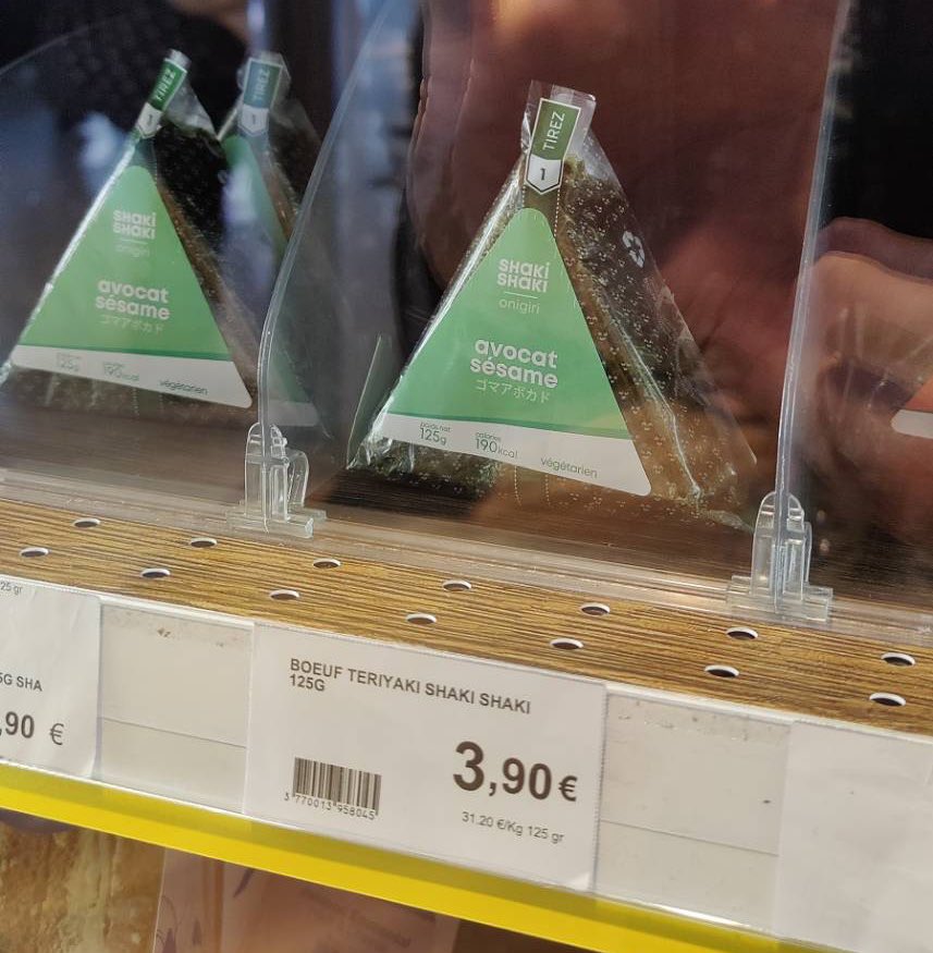家族に会いにフランス一時帰国してるんだけど、おにぎりが3.9ユーロ(日本円で約560円)で泣いてる。なんだよゴマアボカドって…。値札にはビーフテリヤキシャキシャキって書いてあるしよぉ…適当かよ….。120円の梅はどこだああぁ….! https://t.co/aaSQuXoFhE
