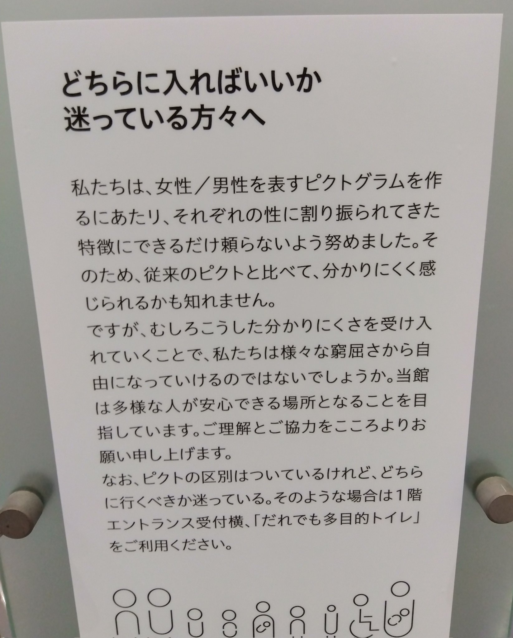 広島現代美術館のトイレ、ピクトグラムを分かりにくくすることで様々な窮屈さから自由になれる、らしいです。ちょっと何言ってるのかわからない。 https://t.co/BC4rav8v2G