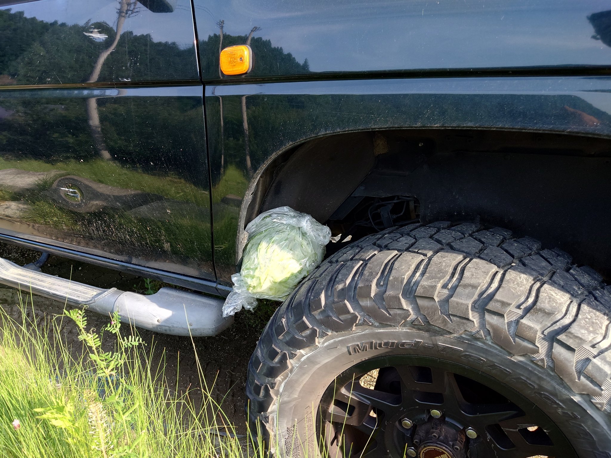 都会ではタイヤの上に小石を置いてあったら「盗難の下見」と言われますが、田舎ではタイヤの上にキャベツが置いてあったら「あげるから持って帰れ」の意味です。 https://t.co/mW0N7HtUgk