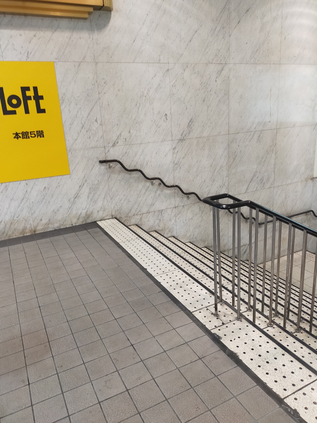 今日用事で岡山表町の天満屋行ったんですよ。地下から上がる階段の手摺がご覧のように波々になってて「しょーがねぇなぁデザイン優先で使いにくいのは困るのになぁ」と悪態つきながら登ったんですよ。(続く https://t.co/uaNhDBYgbT