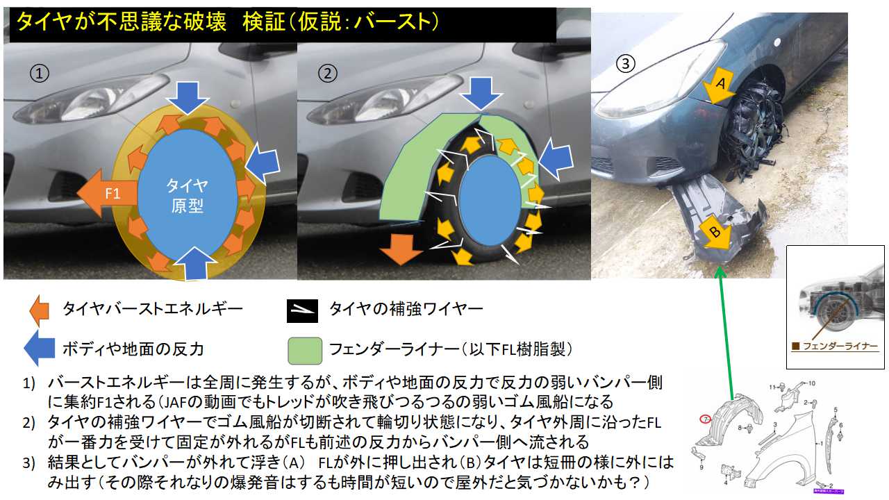@tonoko14 @emyj_ フェンダーライナーが吹き飛んでいるのでおそらくタイヤのバーストですわね!!!!!!いたずらではないと思いますわ!!!!!タイヤが劣化していたとか、空気圧が高かったなどの原因が考えられますわ!!!!!!