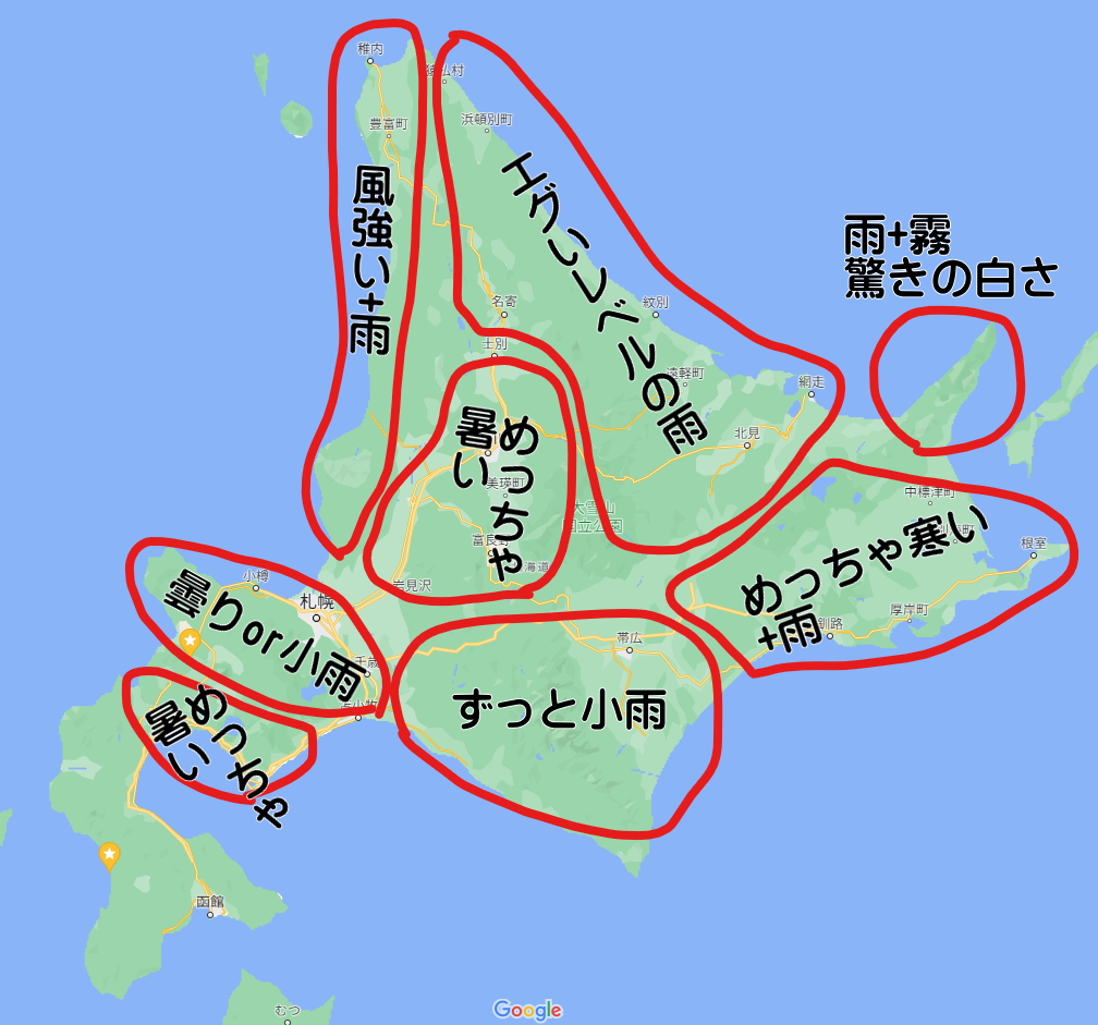 8月にしか来られないと最近の「蝦夷梅雨」傾向の北海道ならこんな感じですよね。みなさんがいらっしゃる8月の“前後”はこの地図の限りではありません。