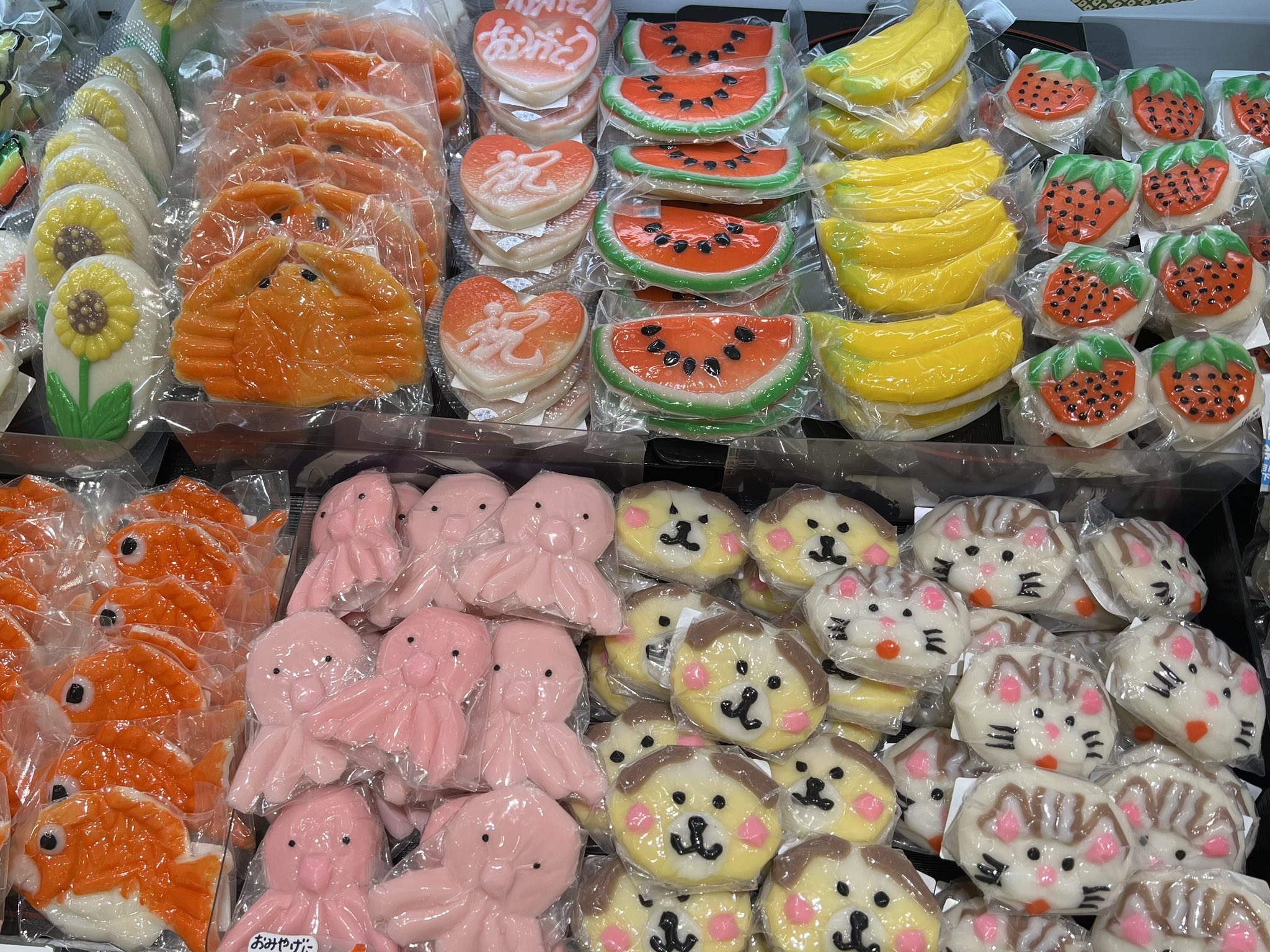 このバリエーションは初めて見た。お盆仕様かな…冬には雪だるまが出てきてバレンタインデーにはハートで山盛りになるかまぼこ売り場。