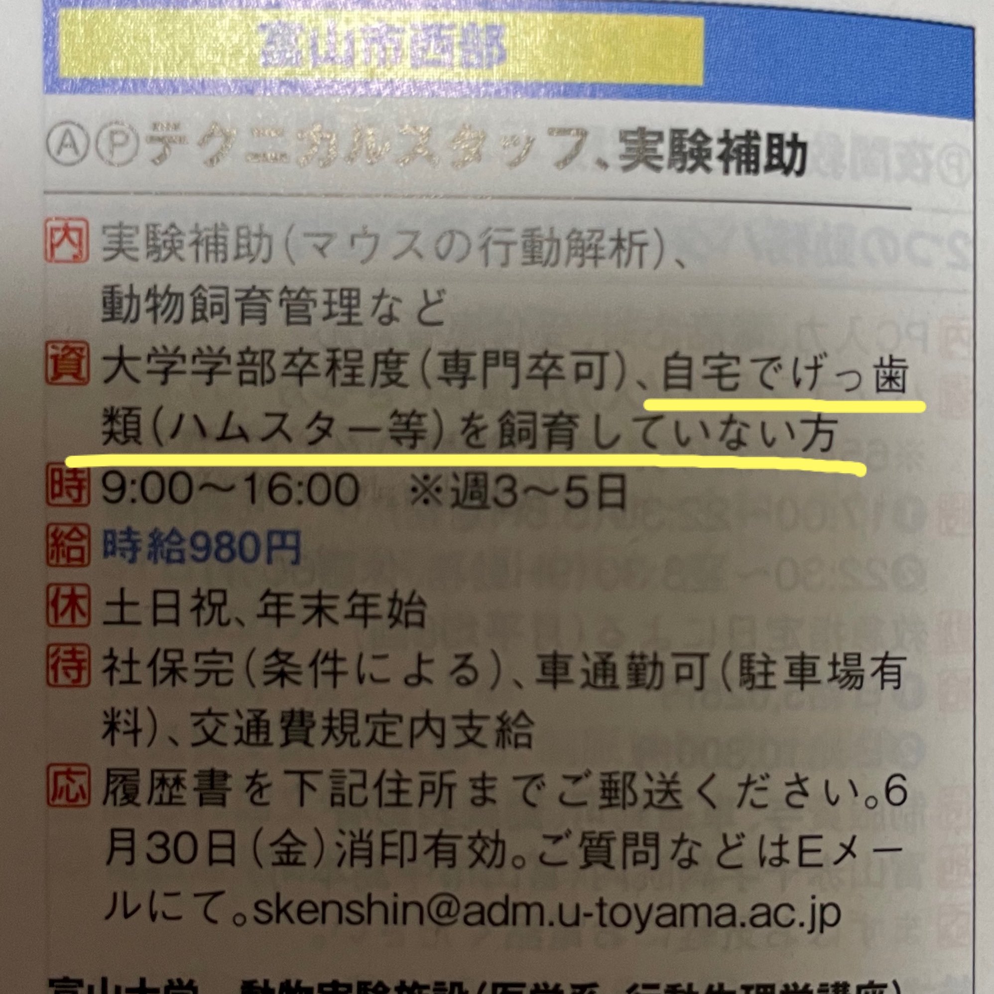 弊研究室の求人に興味を持って頂きありがとうございます。既に書かれていますが、一般のペットが持っている微生物の中には実験用マウスが感染すると実験ができなくなるものがあります。衛生条件の厳しい空間で飼育してますが、ハムスターなどを家で飼育してると微生物を持ち込むリスクが高いのです。