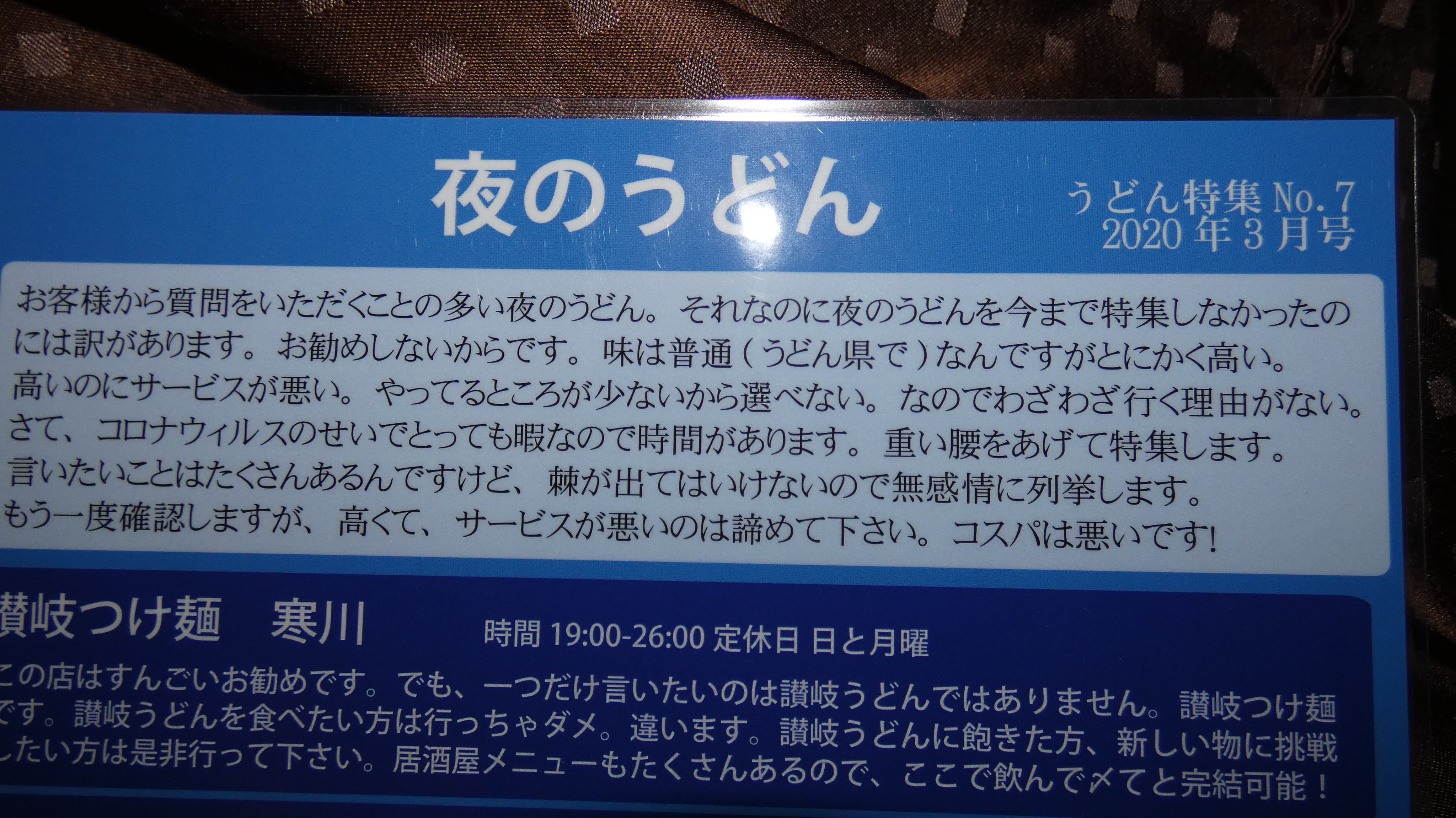 これ高松初心者の方々がよく引っかかる罠なんですが、ホテルにあるフリップにこんなことが書いてあるレベルで高松の夜に開いてるうどん屋は地雷なんですよ・・・。自家製麺+人気の店は麵無くなって昼過ぎぐらいにはお店閉めちゃうんで・・・。 https://t.co/DCLl2mnhVE