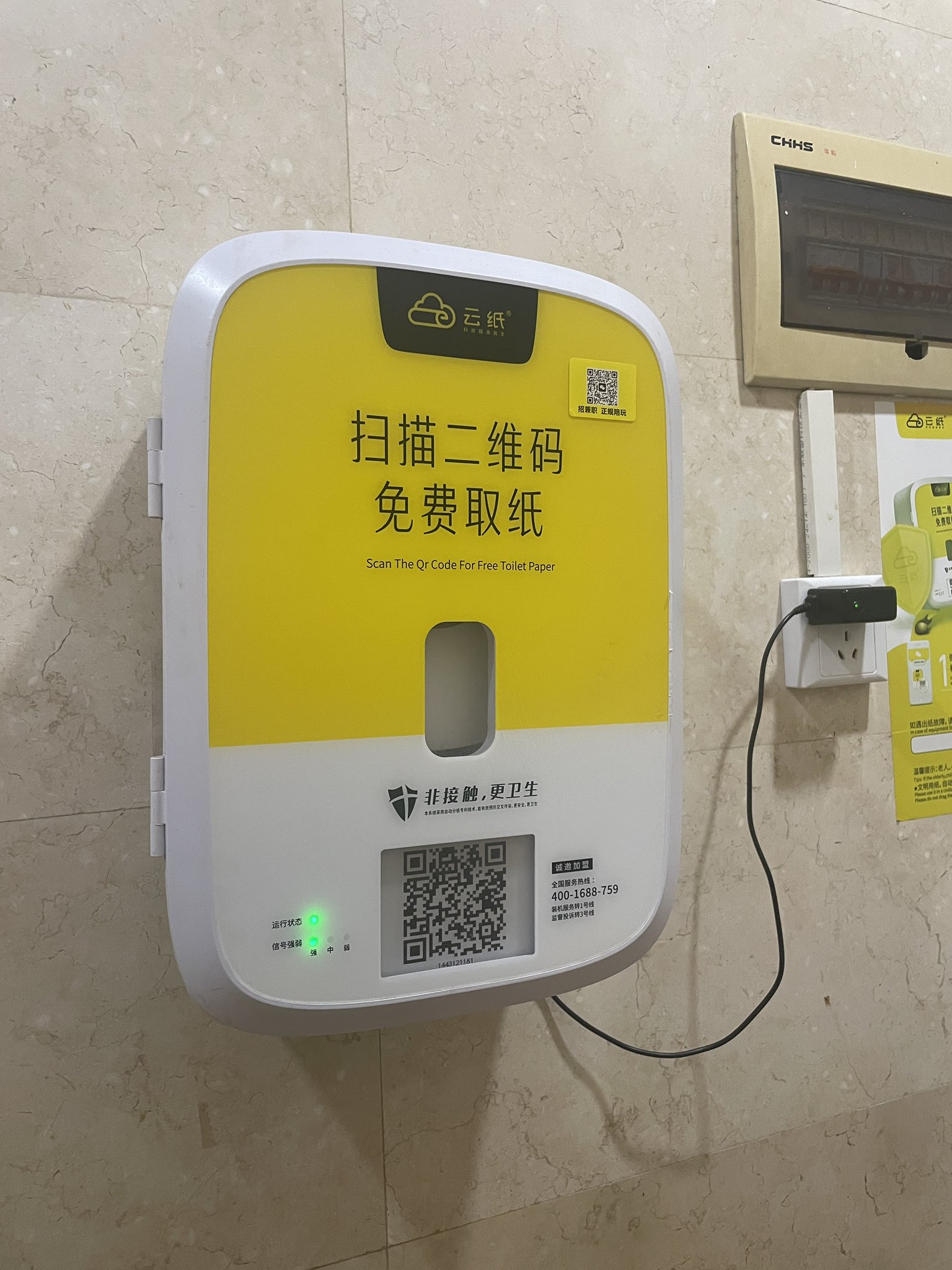 中国の公衆トイレ、無料トイレットペーパーの機械が入口にある。ただQRコード読んでスマホで30秒CM見ないと出てこないという鬼のシステム。トイレ行きたくて駆け込んだ人にとっては地獄の30秒。資本主義恐るべし! https://t.co/7CqlJzw6XW