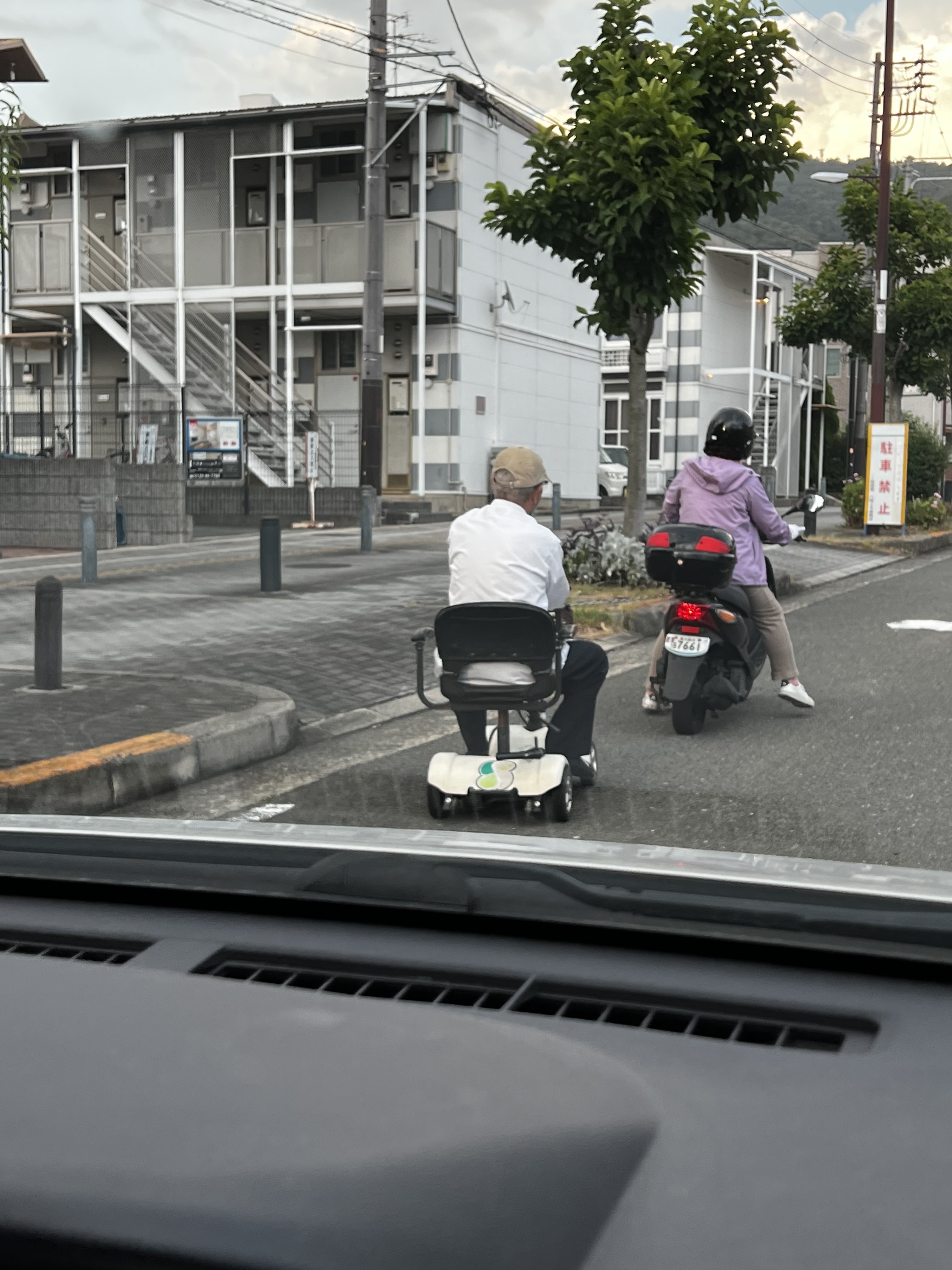 おばあちゃん原付に金属チェーンで牽引されてるおじいちゃんセニアカー面白すぎる ずっとばいんばいんなってておじいちゃん首ガクンガクンなってた https://t.co/ciaLyRC8vc