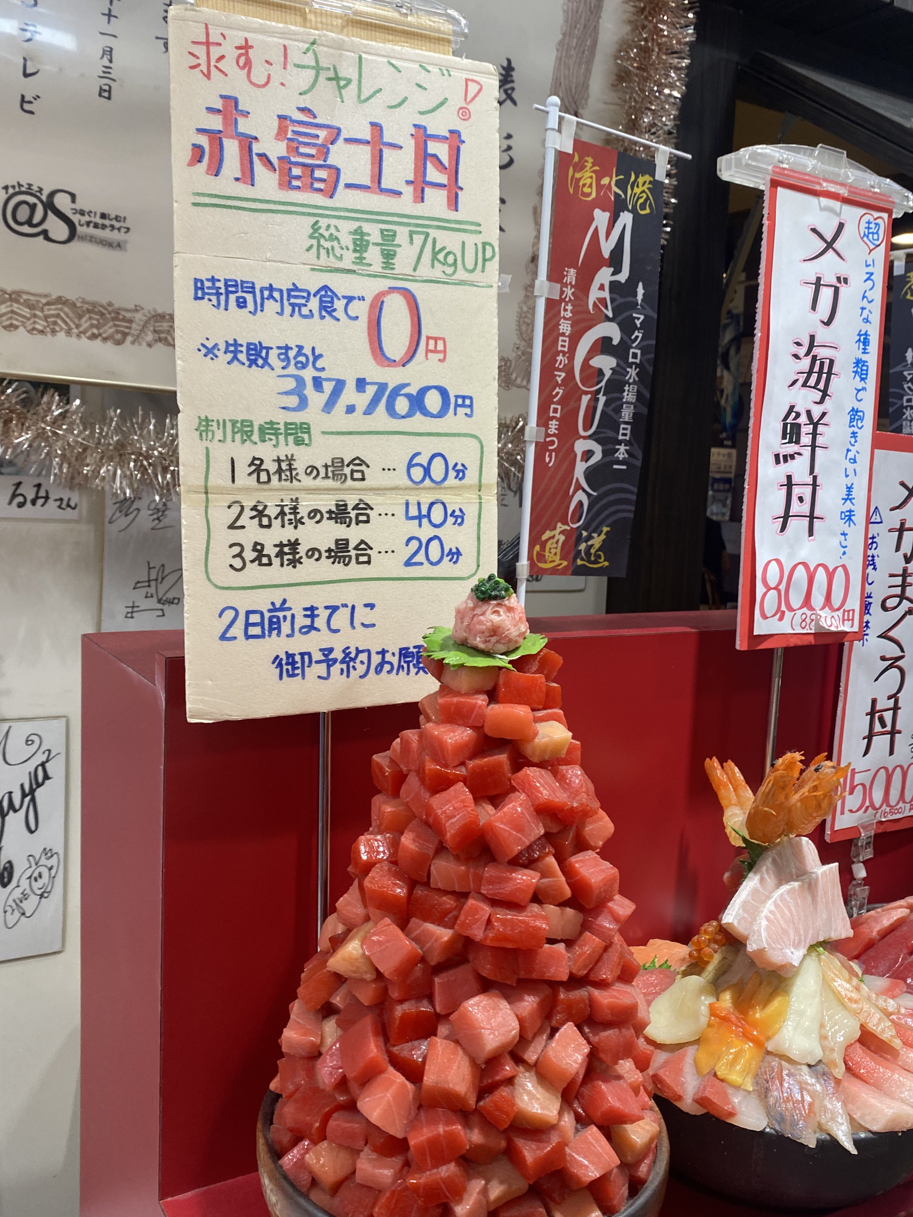 青春18きっぷで体力付けたい皆さん。清水港でこんなメニューが‥‥完食しても動けなくなる地獄‥‥未食でも全財産を失う地獄(?)なメニューですね! https://t.co/N83901FrM1