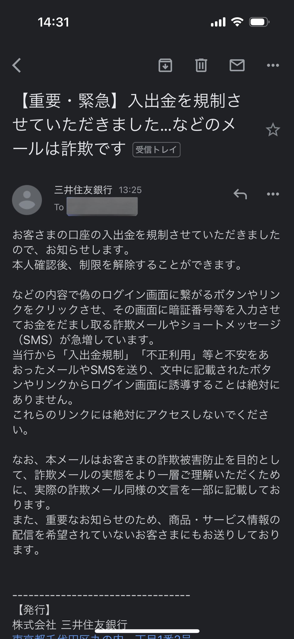 三井住友銀行のこのメール考えたやつマジで2時間正座してくれ【重要・緊急】入出金を規制させていただきました…などのメールは詐欺です https://t.co/AcBQiUoeD3