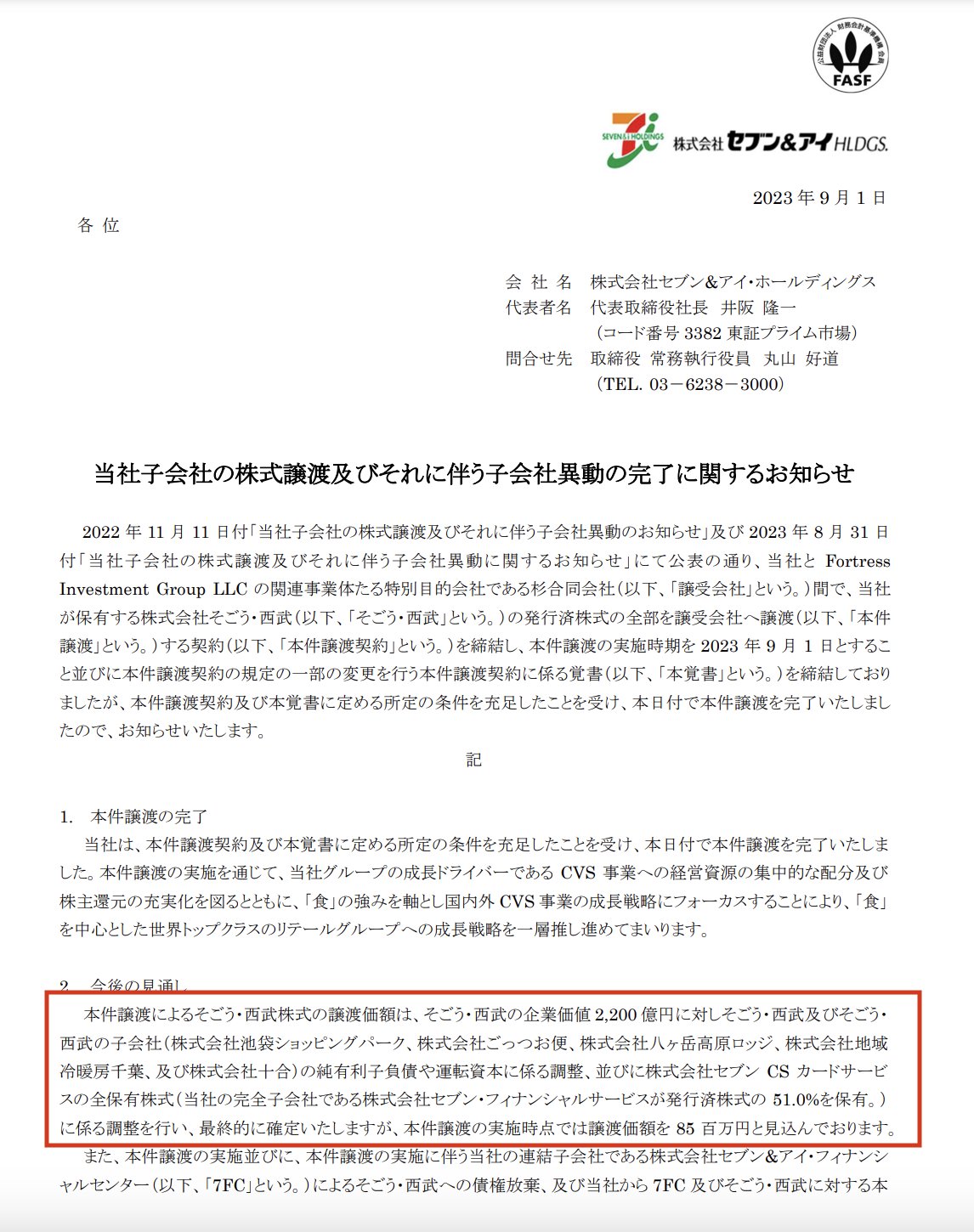 セブン&アイによる「そごう・西武」の売却が完了。実質的な売却額は8500万円の見込み。そごう・西武の企業価値 2,200 億円に対して、負債額などを差し引いた金額。 https://t.co/3qBIbaRNrW
