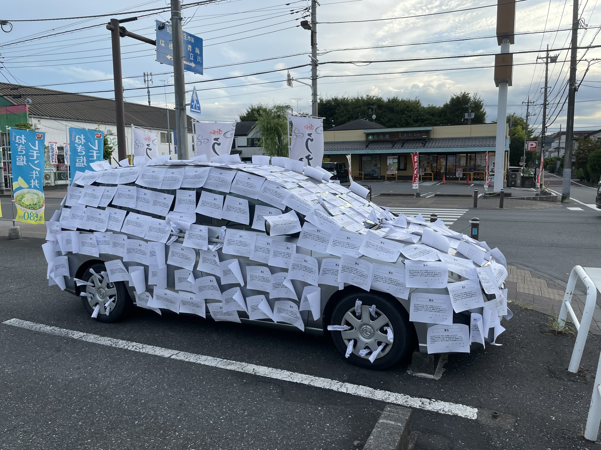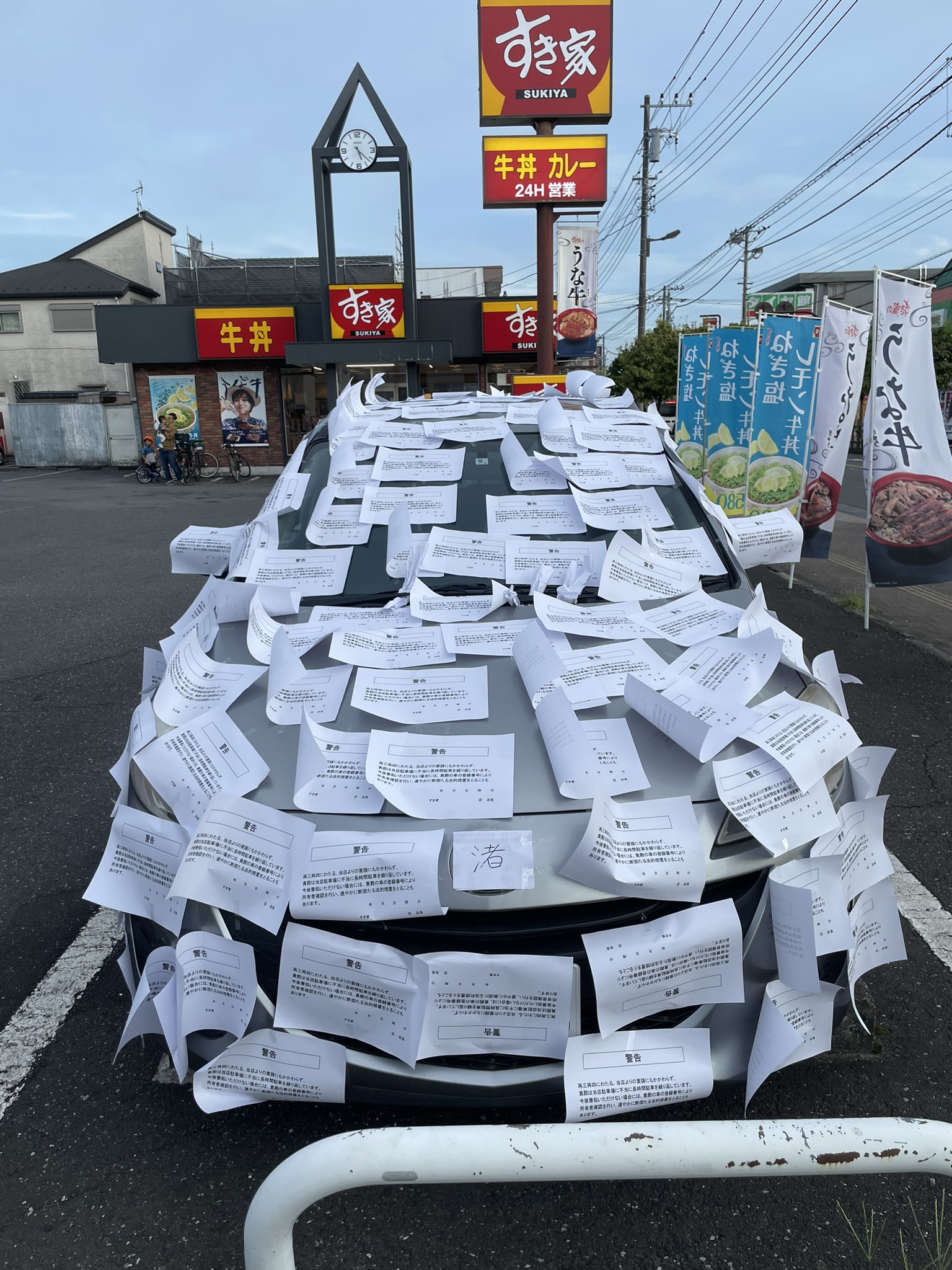 すき家に違法駐車するとこうなるらしい。無数の張り紙あって草。 https://t.co/VEE8KNH8Cb