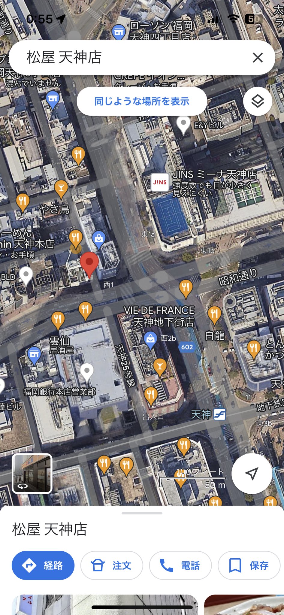 天神に松屋あったっけ?と思って調べたら昭和通りの郵便局近くか、奥のビルが紳士服のフタタね。道はアホみたいに狭くて笑ってしまった。 https://t.co/DfyysBC5kc