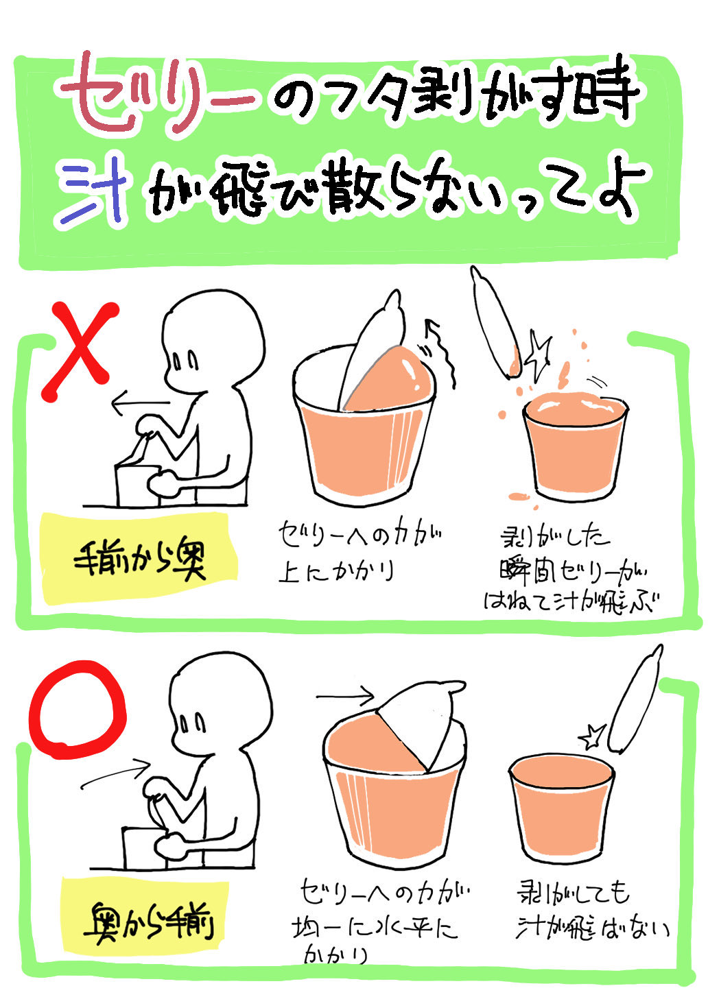 「今すぐ試してみたい!」…あるX民による“汁が飛び散らないゼリーの開け方”イラストが話題にwww