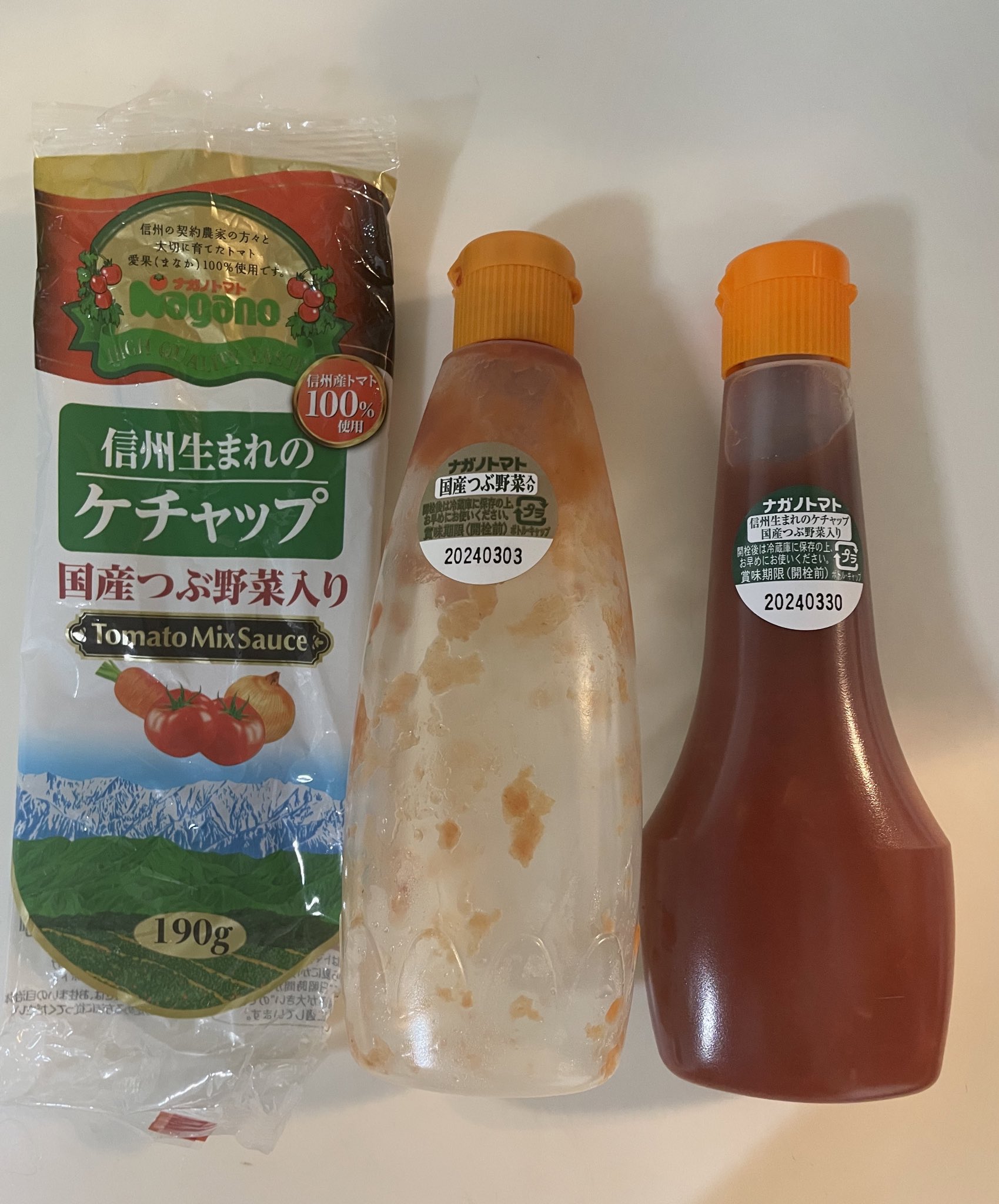 容器形状的には最後まで使いやすくなってるとは思うものの、お値段そのままかやや値上がりで295g→190gの減量は厳しいな。ナガノトマトのケチャップは美味しいからそのぶん高価格なのもわかるんだけど。
