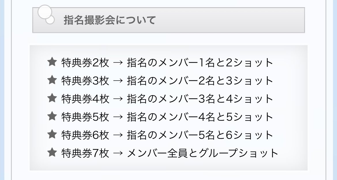 グループが好きで、推し以外ともチェキ撮りたいけど一人一人だと特典券10枚かかるから、まとめて6枚で済ます!推し含めメンバー全員に自分が誰推しか認知されていたら、これはこれで間違いなく楽しいけどね。経験上。
