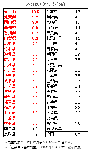 @tmaita77 20代で日曜日に一回も食事を摂らないって、どういうことだろう。貧困なのか、無気力なのか。そんなに健康や宗教で断食している人がいるとは思えないし。食べない理由を調査して欲しいものです。