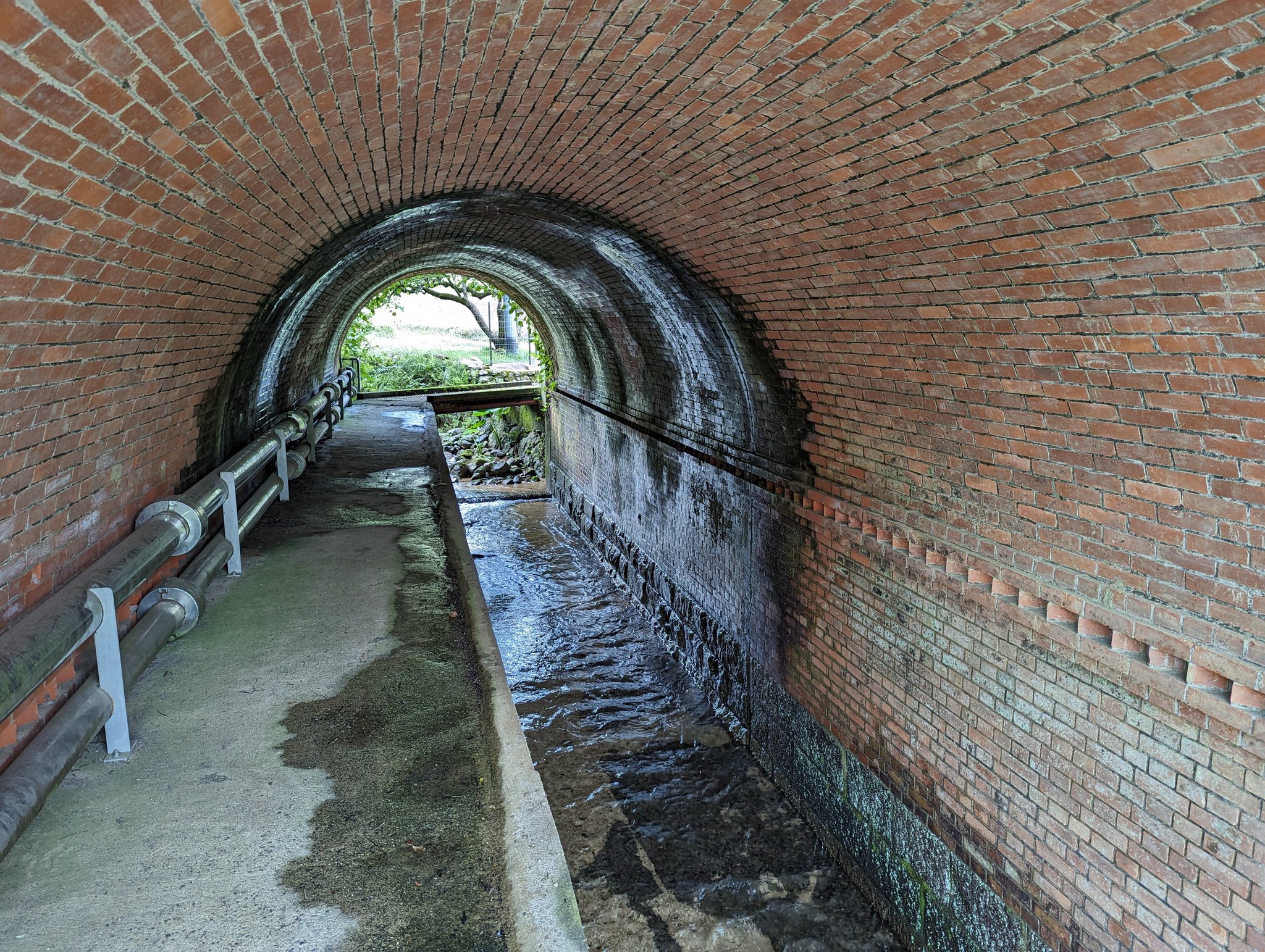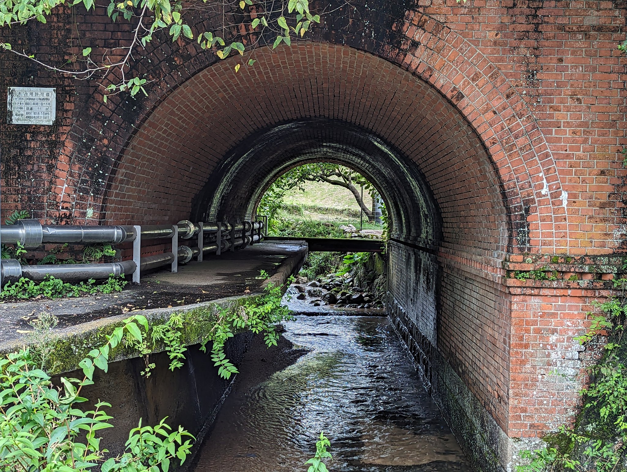 トンネル…じゃなかった橋梁の内部もレンガ巻きで少し凝った造りになっています。歩道に手すりはなく、それよりも歩道の下に支柱がないので、ちょっとスリリングです^^;これ、トンネルじゃなくて橋なんですよね。上を鉄道が走ってて鉄道施設なので。水路や道目線ではトンネルでも、鉄道目線では橋。 https://t.co/NMuFUT2UoY