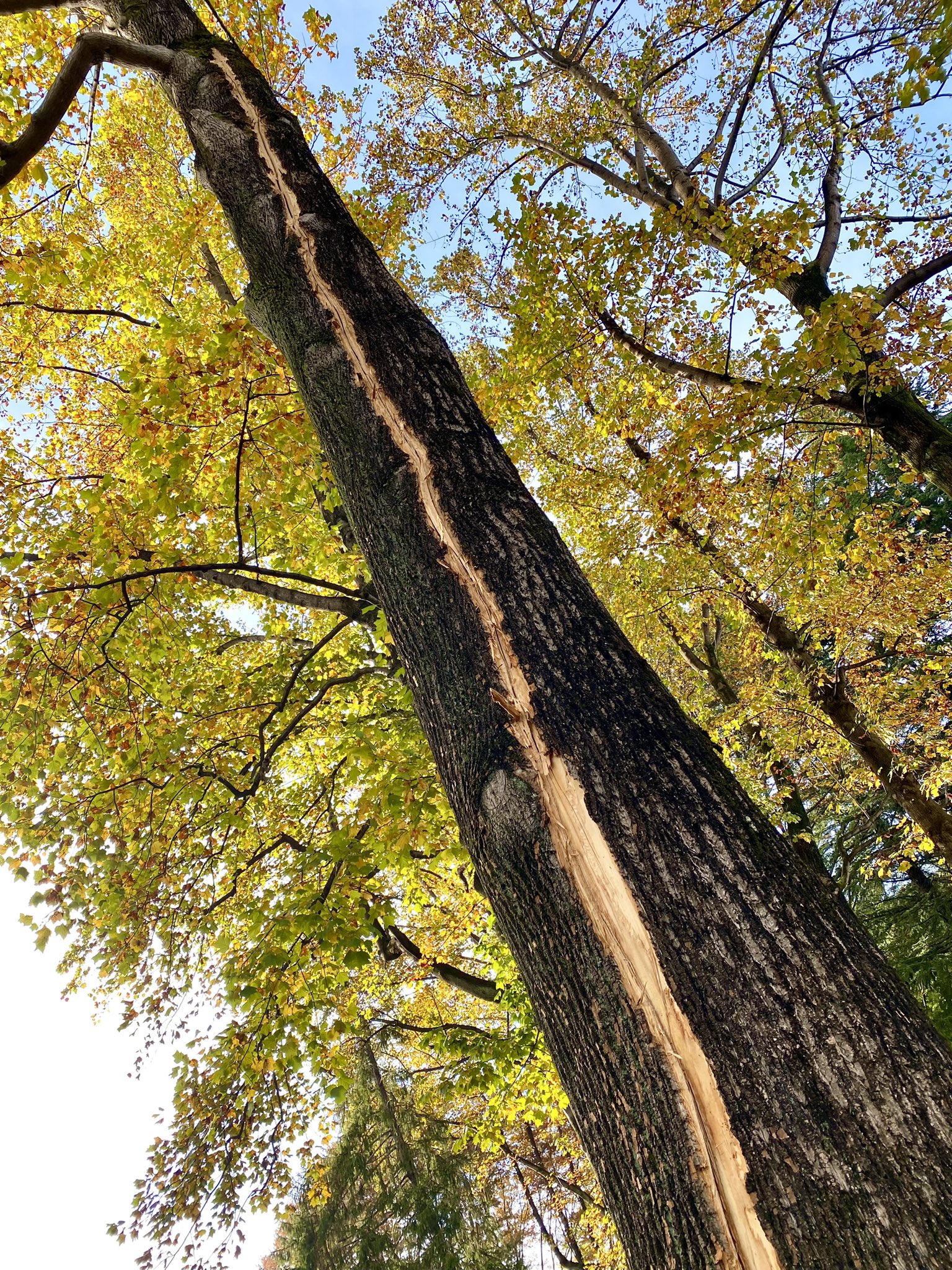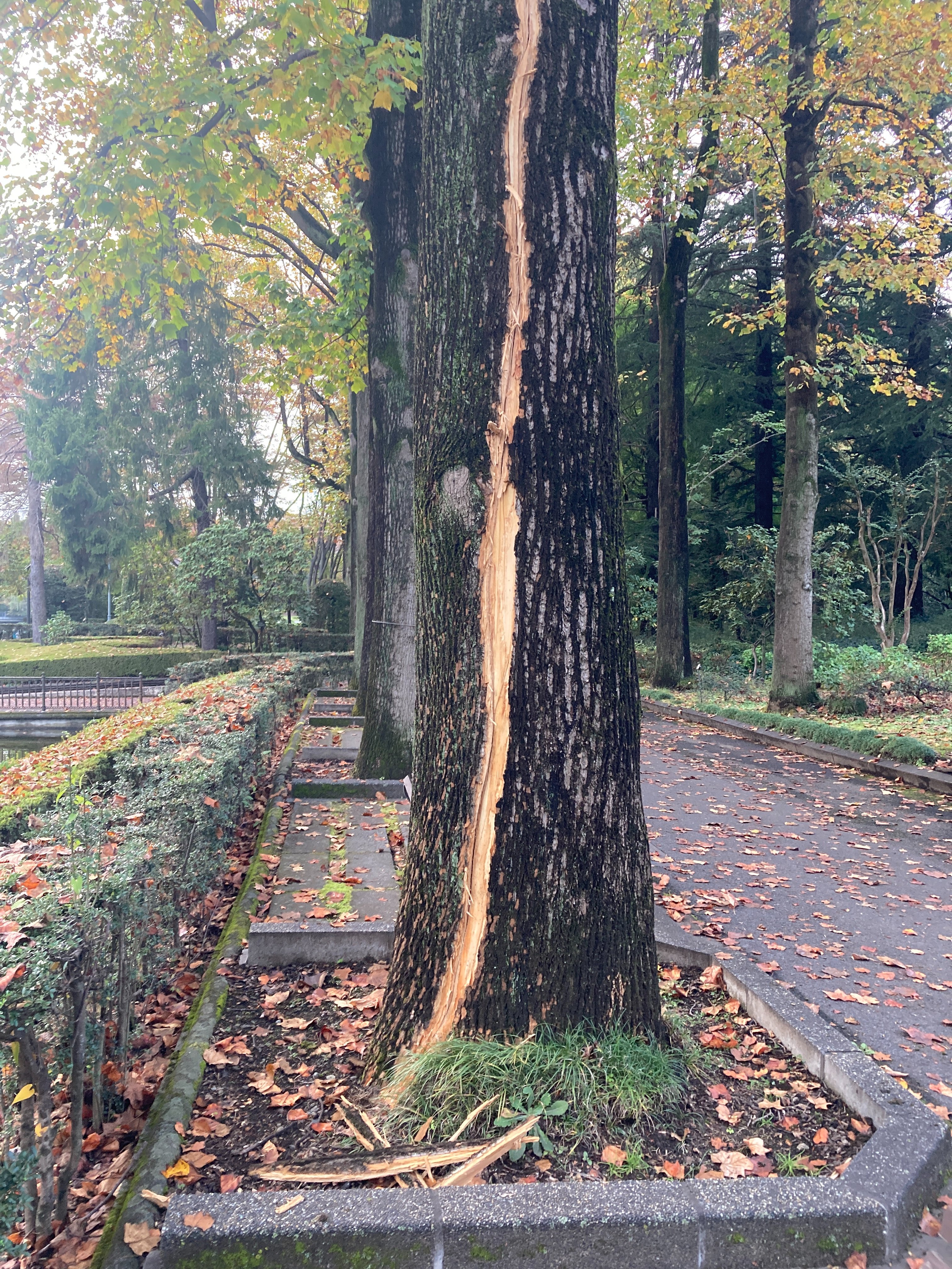昨日の午前中は激しい雷雨でした。中央公園のユリノキも落雷を受けたようで縦に皮が剝がれていました。雷のパワーすごいです。 https://t.co/i4dvuKRGM0