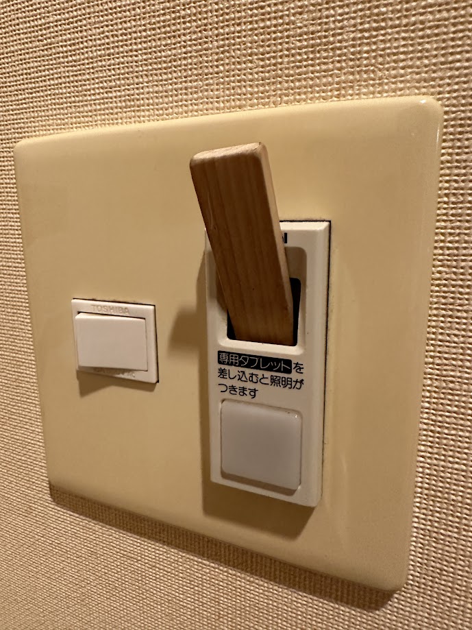 お宿によってはカードキーのチップを感知して作動するところもあるみたいですねそういう場合別のもの差し込んでもうんともすんとも言わなかったりしますw