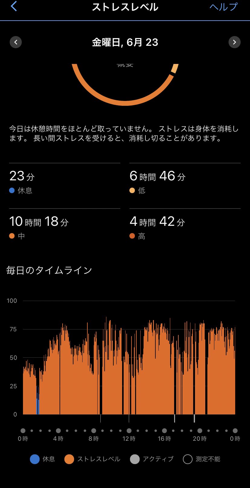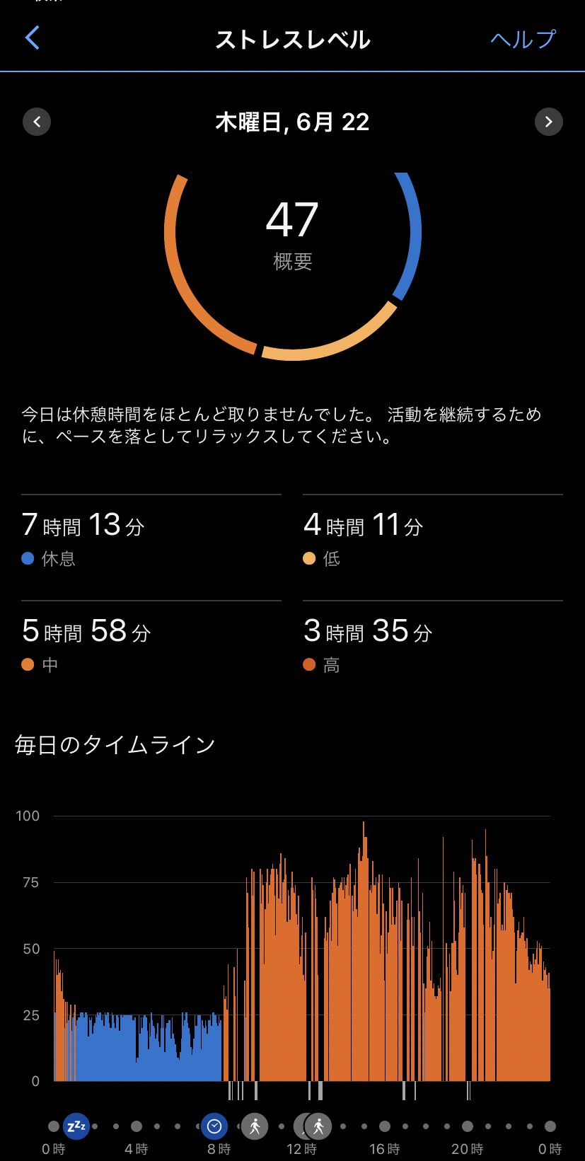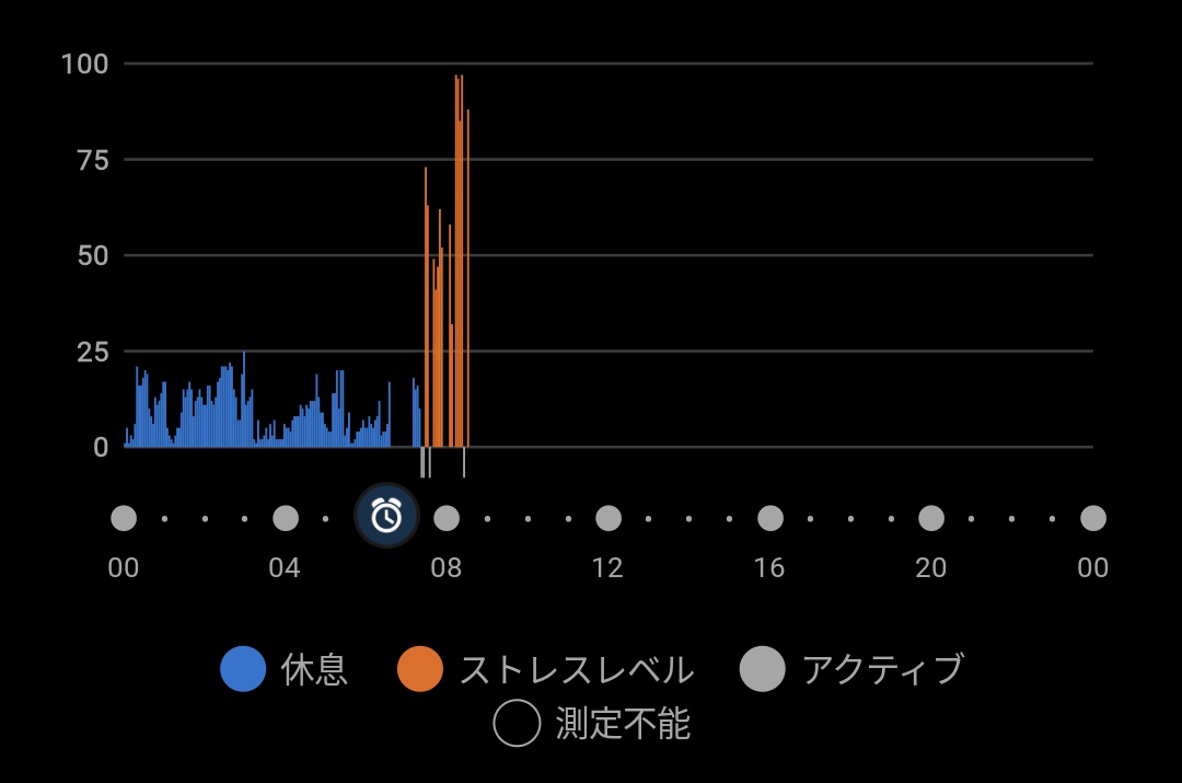 画面からするとガーミンだ脈拍拾ってるので手首曲げてるとストレス警告来るんだが、これって状況的には本当にストレスかもしれん
