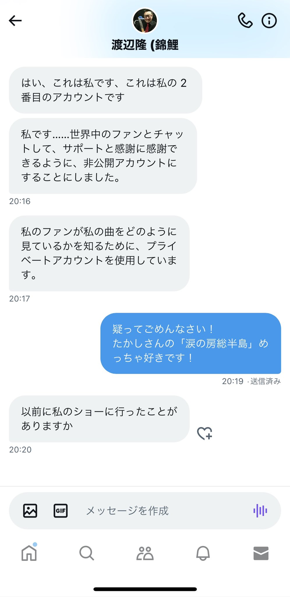 錦鯉の隆さんと久々にやり取りしてるのですが、しばらく会わない間に演歌歌手になってたようです。 https://t.co/HqoUKFKOr1