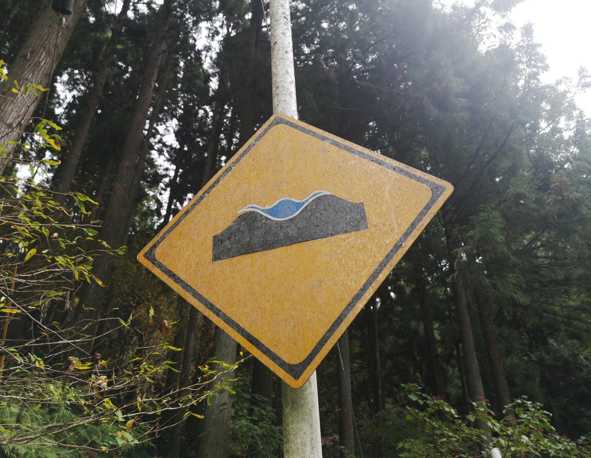 普通は”凹凸あり”の標識で代用してて、水が入ってるのは珍しいようです。滋賀県道 多賀永源寺線にて。